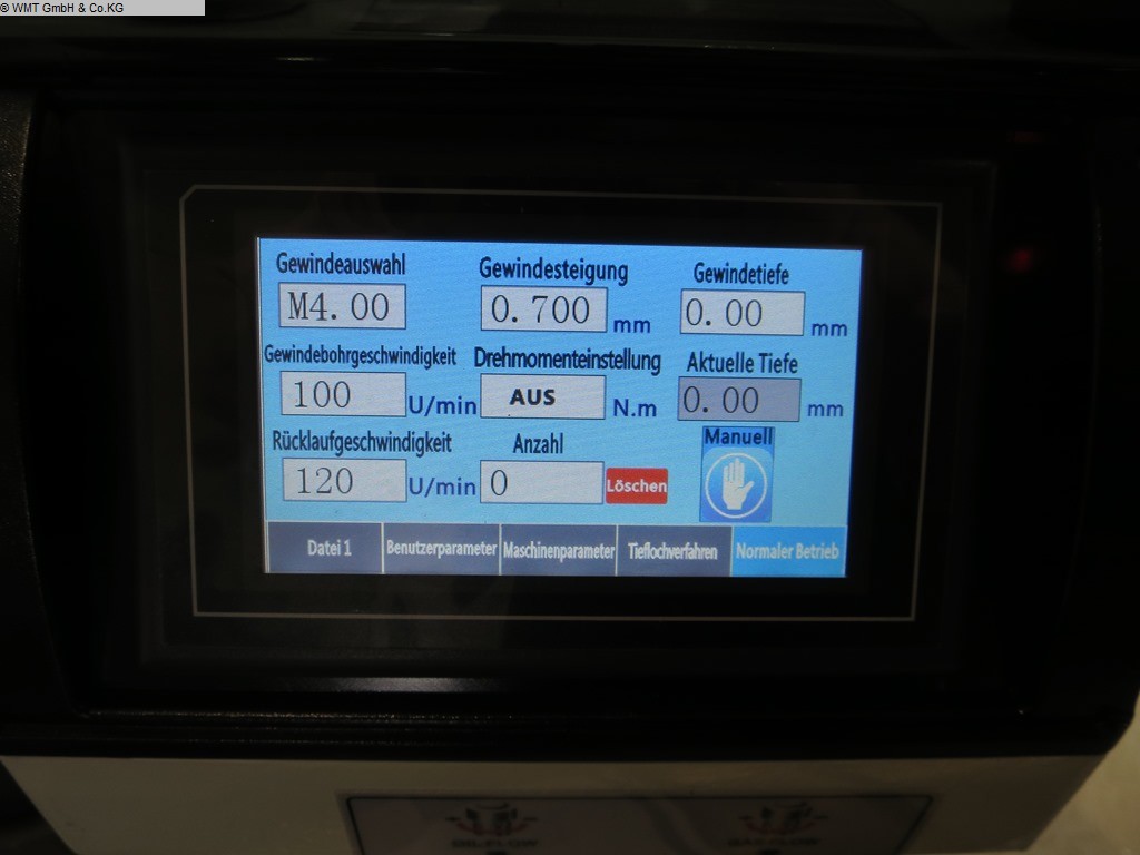 Gewindedurchmesser: 12 mm Drehzahl stufenlos: 375 U/min. Arbeitsbereich: 180 - 2000 mm Motorleistung: 0,7 kW Gewicht: 28 kg Elektrische Gewindebohrmaschinen für M3 - M12 Gewinde, Winkel einstellbar. Mit Arbeitsbereich von 180 - 2000mm. 7 Stk. Schnellwechselfutter mit Rutschkupplung. Über Display einstellbar: variable Drehzahl, Einstellbare Tiefe, Materialauswahl, Wahl der Hauptdrehrichtung, Gewindeauswahl. Die Daten fü, dieses Inserat wurden erstellt mit ModulMWS - die Maschinenverwaltung von LogoTech oHG.