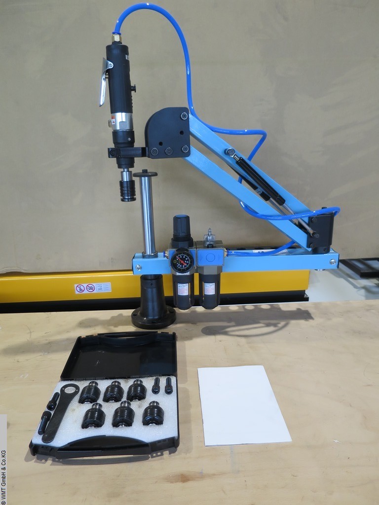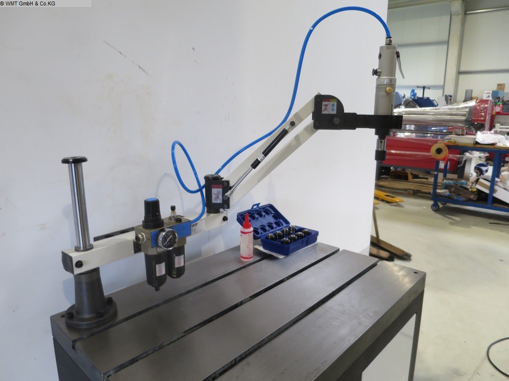 Gewindedurchmesser: M3 - M16 metrisch Drehzahl stufenlos: 250 U/min. Arbeitsdruck: 6 - 8 bar Arbeitsbereich: max. 1100 mm Gewicht: 15 kg Abmessungen L x B x H: 700 x 280 x 250 mm Pneumatische Gewindebohrmaschine Ausführung mit einem einstellbaren Winkel, horizontales Gewindebohren möglich Pneumatische Gewindebohrmaschinen für M3 - M16 Gewinde, Winkel verstellbar. 8 Stk. Schnellwechselfutter mit Rutschkupplung. Dokumentatipon in Englisch! Optional: Aufspanntisch mit Nuten Typ: FL-WB Die Daten fü, dieses Inserat wurden erstellt mit ModulMWS - die Maschinenverwaltung von LogoTech oHG.