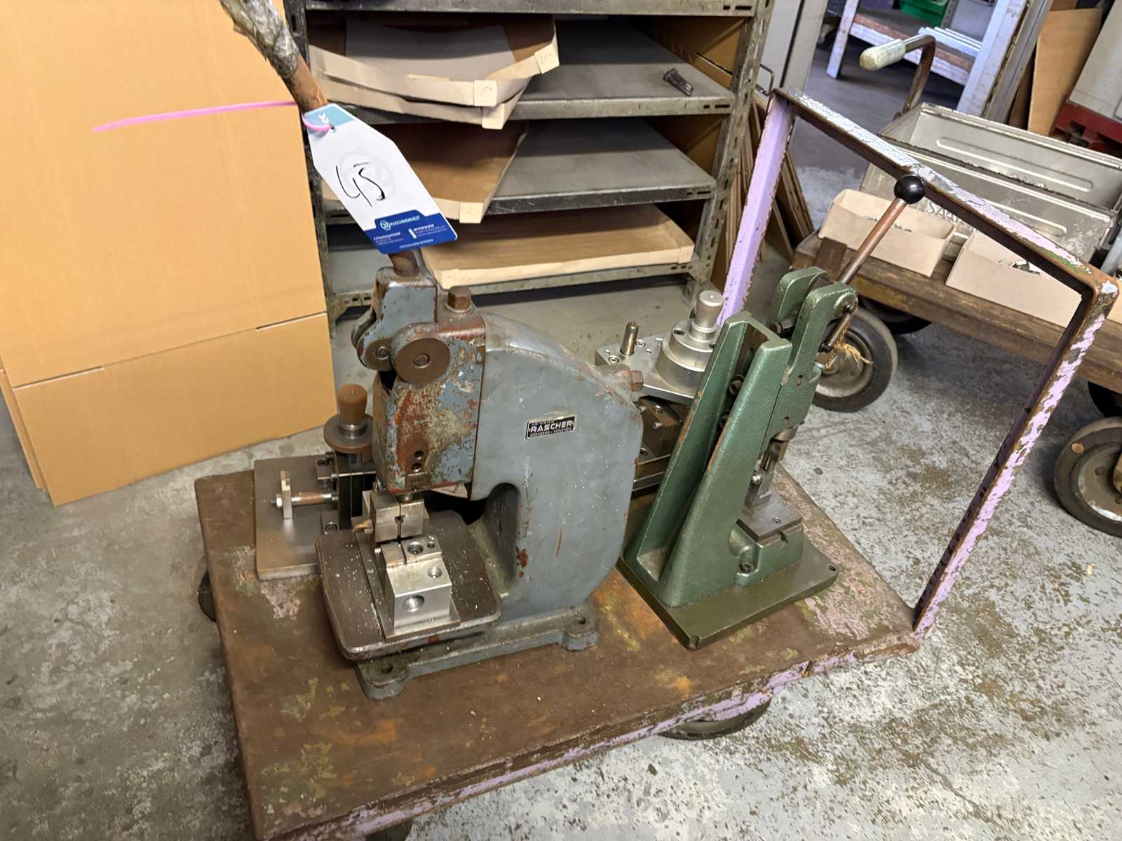 Handhebelpresse, Dornpresse, Drehdornpresse FUTTERS ( LONDON ) LIMITED. No 900-0000 Ausladung: 140 mm Hub: max. 65 mm Tisch: 60 x 81 mm, Werkzeugaufnahme: Ø 38 mm Stößeldurchmesser: Ø 32 mm, Werkzeugaufnahme: Ø 18 mm mit Stanzwerkzeug: Ø 13 mm un Materialniederhalter ( verstellbar ) gebraucht, geprüft ! Abmessungen ( betriebsbereit ): 270 x 160 x 670 mm