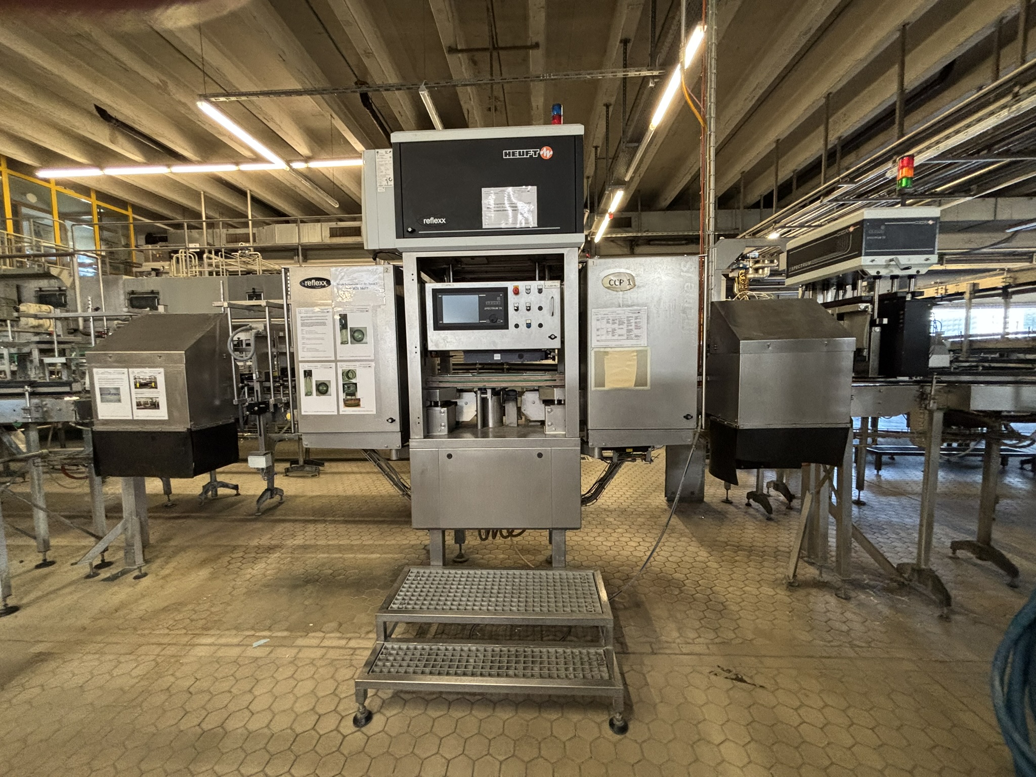 Übersicht  Der Heuft InLine IXs reflexx ist ein Leerflascheninspektor für die Qualitätskontrolle in Abfülllinien. Die Maschine wurde im Mai 2012 in Betrieb genommen, befindet sich in sehr gutem Zustand und ist kurzfristig einsatzbereit. Technische Details  Leistung: Bis zu 46.000 Flaschen/Stunde Steuerung: Heuft Synchron TX Netzwerk: Heuft Hlan, inkl. Gateway Lizenzierung: 5 Sortenlizenzen Ausstattung: Softwareassistenten zur Fehlerbehebung und Gebindeumstellung Verfügbarkeit: Kurzfristig einsatzbereit Fehlende Komponenten  Gewindeabblasung (muss bei Bedarf ergänzt werden) Kontrollen  Überwachung des einlaufenden Flaschenstroms (optional) Ausgabe eines Stoppsignals bei fehlerhaften Flaschenmaßen Inspektion des Flaschenbodens, Mündungsdichtfläche und Gewindes Inspektion der inneren und äußeren Seitenwand Erkennung leitender Flüssigkeiten (z. B. Lauge) und Restflüssigkeit ...