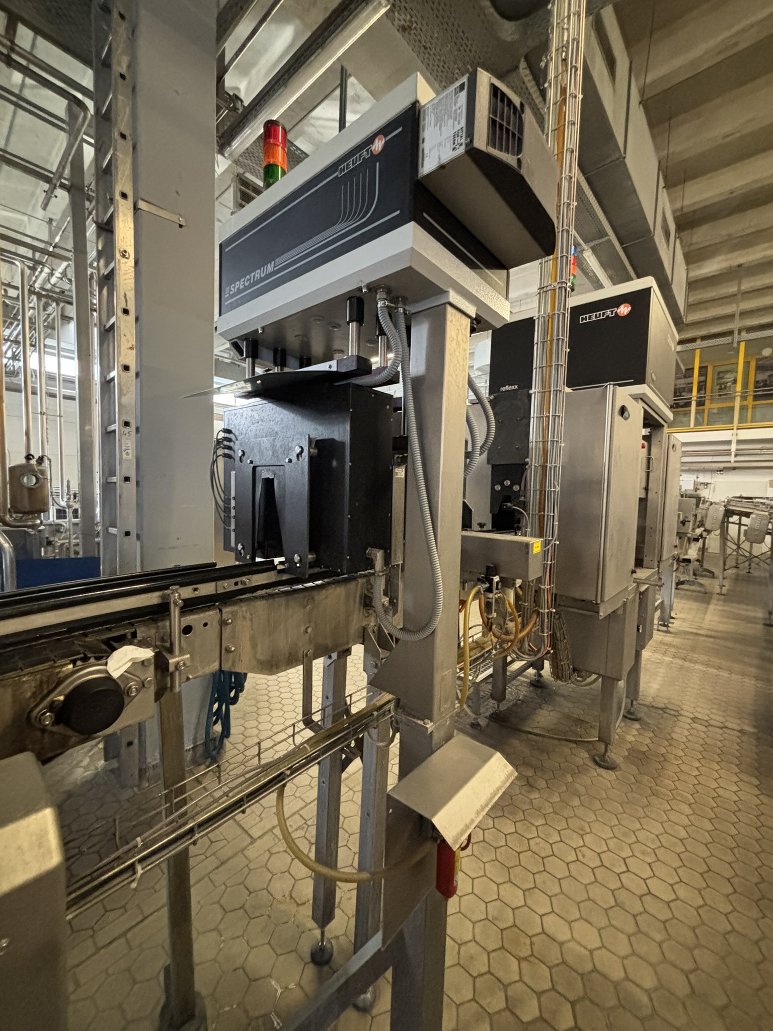 Übersicht Dieser HEUFT Spectrum TX Leergutinspektor wurde 2015 hergestellt und dient zur automatischen Qualitätskontrolle von leeren Glasflaschen vor dem Abfüllprozess. Die Maschine gehört zur HEUFT Spectrum TX-Serie, die die Reflexx-Inspektionstechnologie des Herstellers für eine hochpräzise Flascheninspektion nutzt. Das System erkennt Fremdkörper, Glasfehler und Flüssigkeitsreste im Inneren der Flaschen und stellt so sicher, dass nur konforme Behälter in die Abfüllphase gelangen. HEUFT-Inspektionssysteme werden aufgrund ihrer zuverlässigen optischen Inspektionstechnologie und ihres modularen Aufbaus häufig in modernen Getränkeabfüllanlagen eingesetzt. Die Maschine wurde in einer Hochleistungs-Abfüllanlage mit einer Leistung von ca. 33.000 Flaschen pro Stunde installiert und eignet sich somit für große industrielle Getränkeabfüllbetriebe. Technische Daten Hersteller:  ...