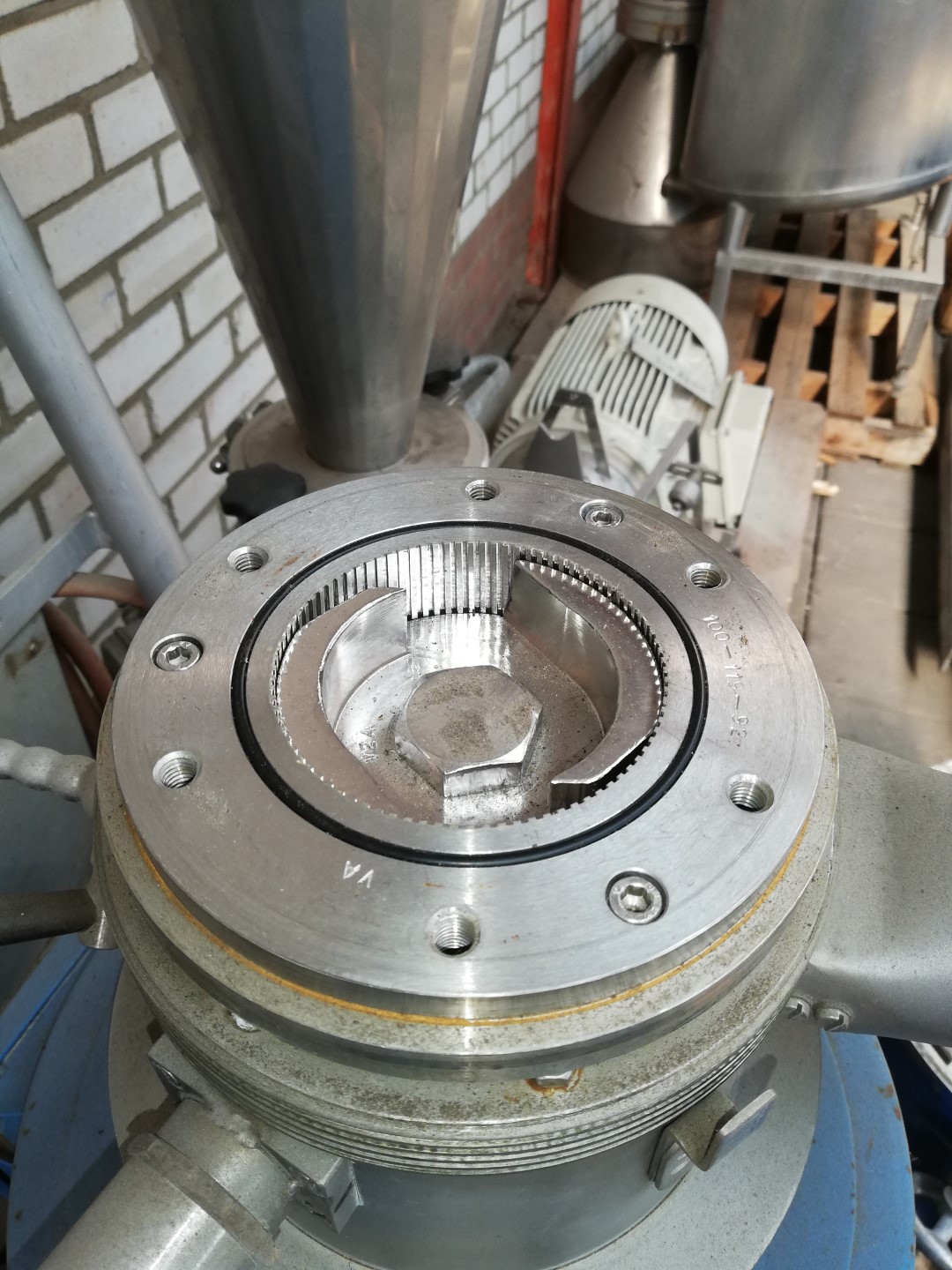 Maschinennr.: 2009.14 Leistung: 5,5 kW Pharmaausführung neuwertig Edelstahl mit Trichter (ca. 60 l) Schaltanlage EEx diverse Ersatzteile, neuer kreuzverzahnter Ersatzmahlsatz LBH: 800 x 700 x 1400 mm Gewicht: ca. 120 kg