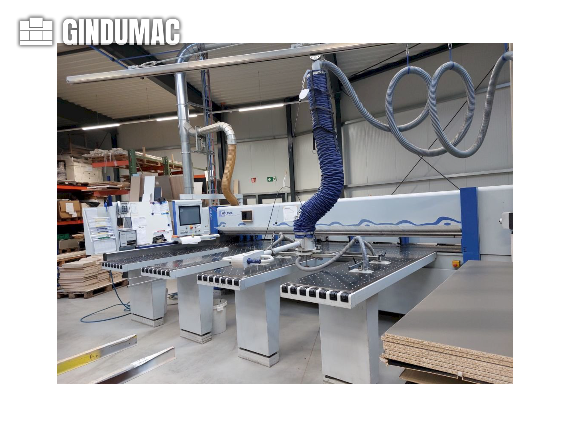 Holzma HP72 Optimat - Horizontale Aufteilsäge Marke: Holzma Typ: HPP82/43/43 Optimat M-Nr..: 0-240-0 Baujahr: 2001 Steuerung mit Cadmatic Holzma CAD Matic Optimierung Junior Cadmatic – on line Gesamtanschlusswert: ca. 26 KW Schnittlänge 4.300 mm Schnittbreite/-tiefe: 4.300 mm Hauptsäge: 13,5 KW Sägeblattüberstand mm: 95 mm Sägehöhe: 82 mm Sägevorschub: 130 m/min Vorritzsaege-Motor: 2,2kW Winkelandrückvorrichtung: Schwert Nuten: Nuttprogram Spannzangen: 7 Programmwagen Vorschub: Stufenloss Luftkissen-Einrichtung 4 Stck. Tisch Abmessungen: 3 (1.760650) + 2.170650 mm Absaugstutzen Durchmesser: 250 mm Absaugvolumen: 5000 m³/ h