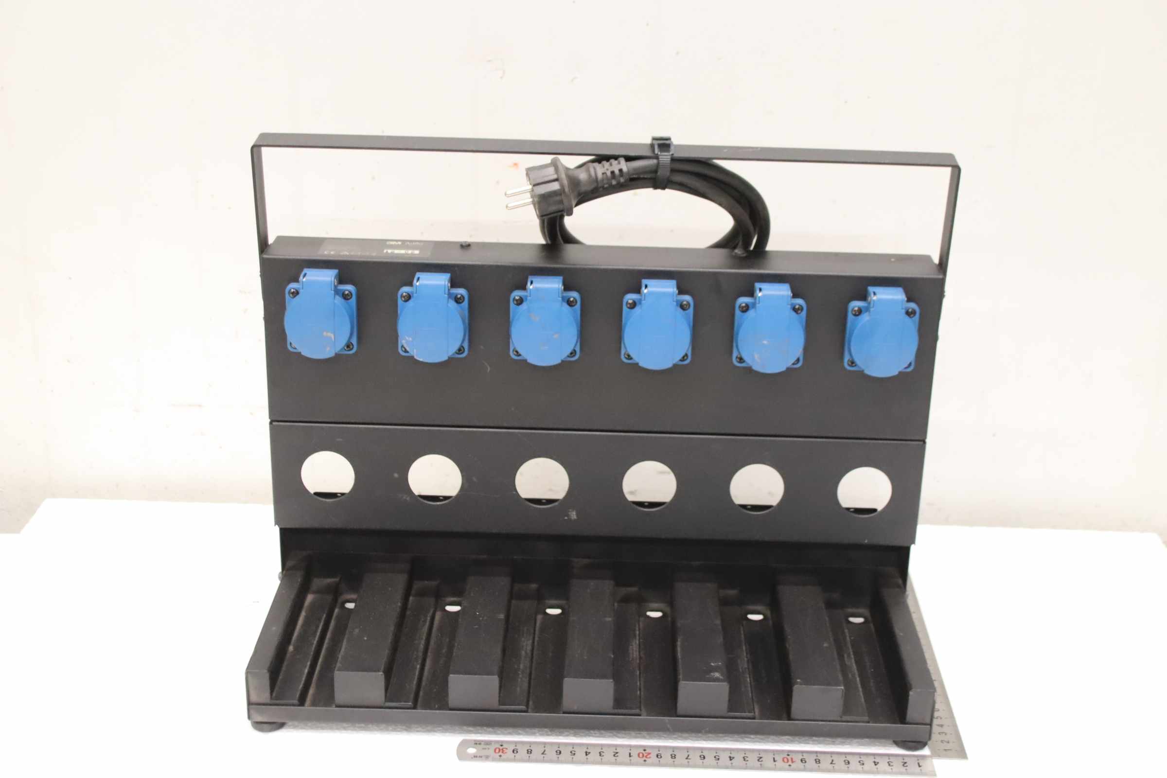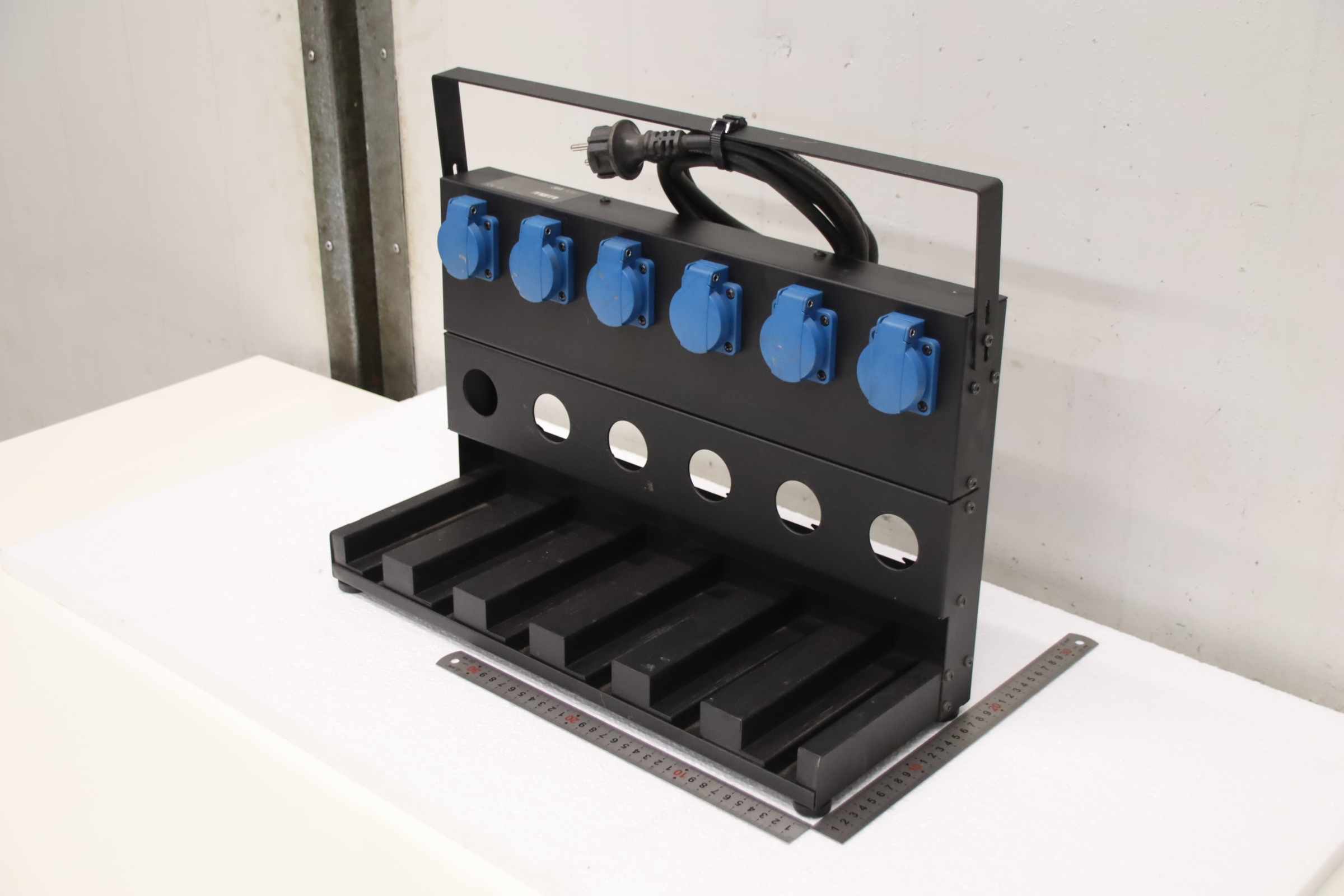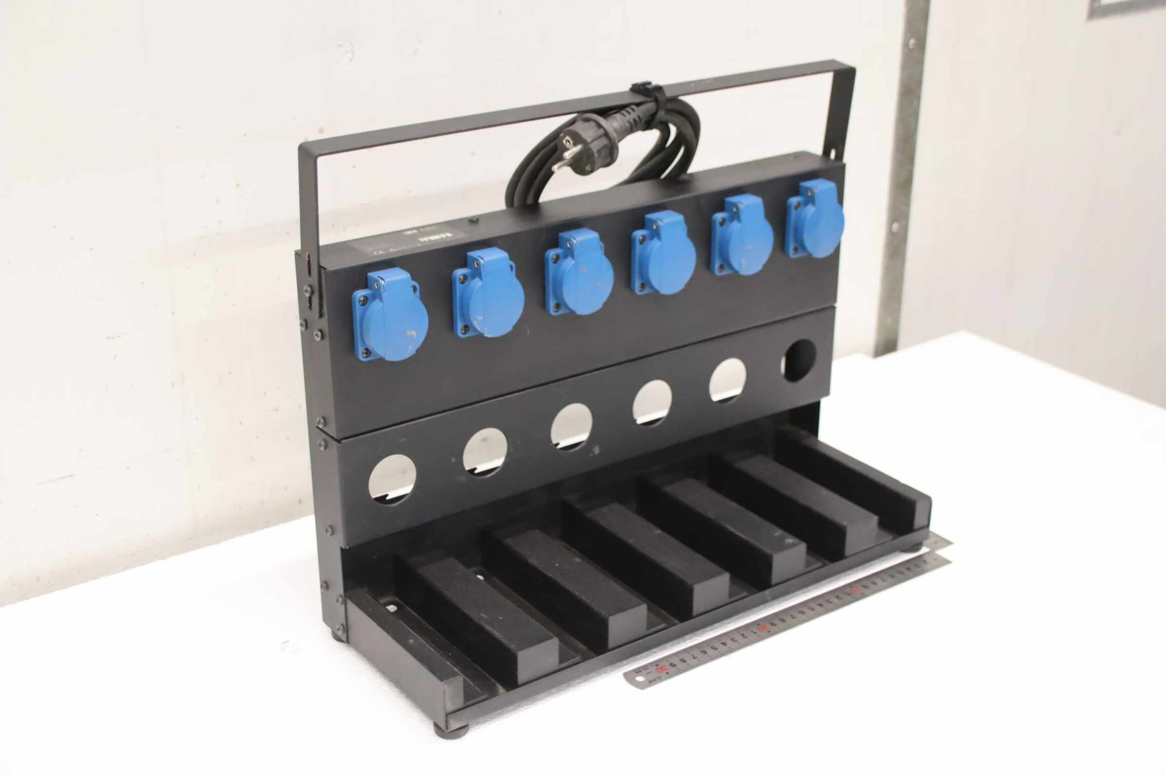 Akku-Ladestation, Pressluftatmer Atemschutz -Schrank aus: Akku-Ladestation für Adflo-System -Art.Nr.: 833706 -Ladestation: für 6 Akku-Ladegeräte (ohne Ladegerät) -Anschluss: 16 A / 250 V -Output: 16 A / 250 V / max 4000 W -Abmessungen: 485/200/H310 mm -Gewicht: 6,3 kg