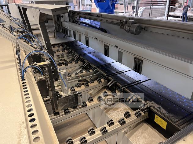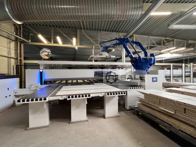 Robotersystem: YASKAWA DX 200 mit Vakuumhebesystem für die Plattenhandhabung. Minimale Plattengröße: 190x100 mm, maximale Plattengröße: 3200x2100 mm, Endplattengröße: 2800x1200 mm. Maximalgewicht: 125 kg, maximale Dicke: 60 mm, minimale Dicke: 8 mm.
