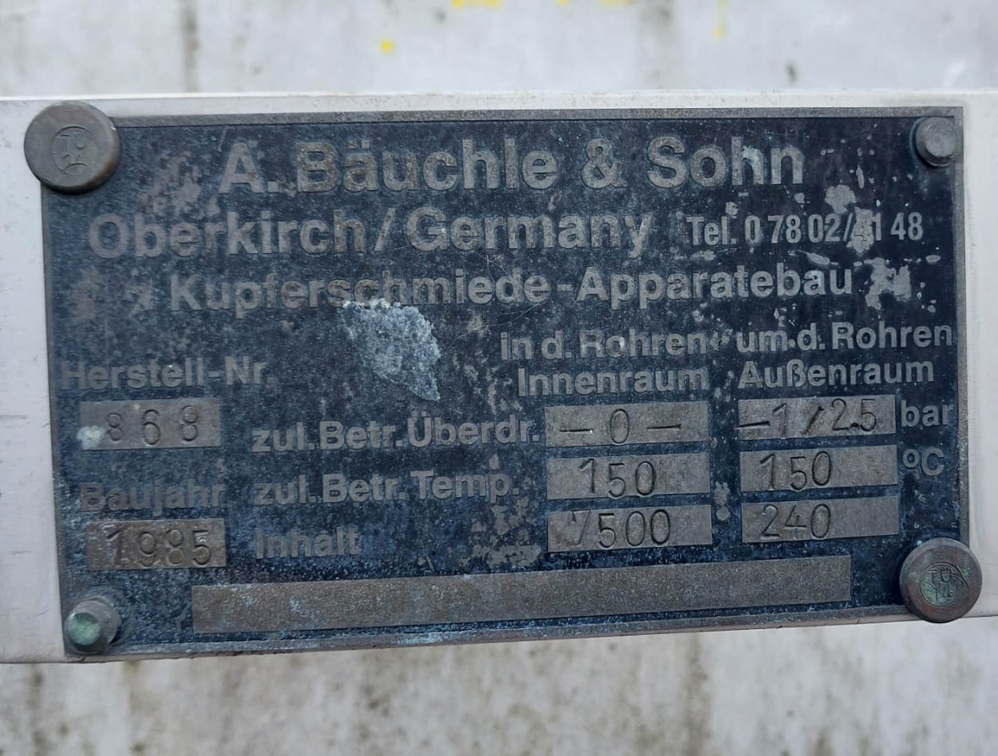 General SKU039E134 HerstellerBäuchle & Sohn Oberkirch №868 Baujahr1985 Gebaut auf Füssecheck Pressure Betriebsdruck0 Bar Haupteigenschaften MaterialEdelstahl Inhalt7500 Ltr. Druck0 Bar Spezifizierte Eigenschaften - Horizontale Behälter MaterialEdelstahl 1.4571 (316Ti) Horizontale Behältercheck Inhalt7500 Ltr. Max. Temperatur150°C. Mit Doppelmantelcheck240 Ltr Information StandortBarneveld Platzbedarf3,2x2,2 M Totalhöhe2,6 M Gewicht2150 KG Technical specs Zusatzinformationjacket pressure -1/2,5bar Was Sie von Maschinen von Foeth erwarten können: -- Maschine funktioniert fähig -- Zu einem reduzierten Preis im Vergleich zu Neuem -- Bereit, überall auf der Welt zu versenden -- Gerne können Sie die Maschine in Barneveld, Niederlande, inspizieren. Bitte besuchen Sie uns in Barneveld für viele andere Maschinen!
