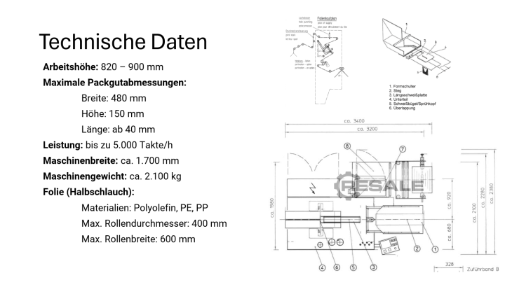 Maschinenbreite: ca. 1.700 mm, Gewicht: ca. 2.100 kg