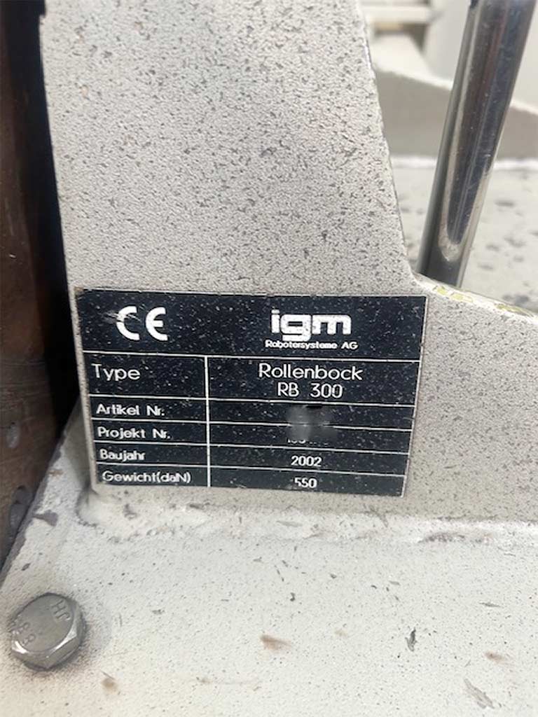 Eine komplette Schweißanlage IGM mit Roboter steht zur Verfügung. Roboter: igm RTI 2000, Rollenbock: igm RB 300, Positionierer: igm RP 300, Steuerung: SPS/Kuka K C2. Ohne Werkstückaufnahmen. Dokumentation vorhanden. Eine Besichtigung vor Ort ist möglich. Voraussichtlich im Mai 2026 verfügbar.