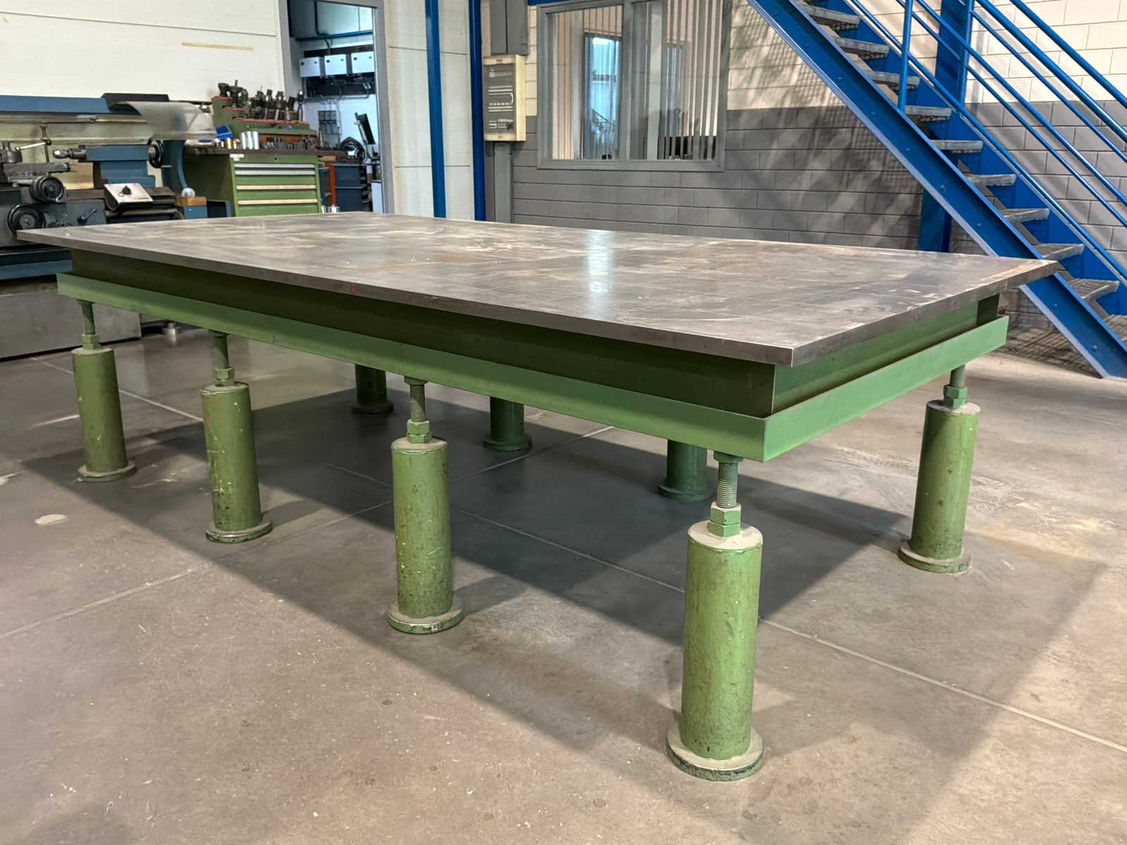 Tischlänge: 3000 mm Tischbreite: 1500 mm Tischhöhe: 200 mm Bohrung: 28 mm Gewicht: 1425 kg Ausstattung: - 6 Füße Grundausstattung 650 mm - Durchgehärteter Werkzeugstahl X8.7 + Plasmanitrierung - Materialstärke ca. 24,5 – 27 mm - Seitenwange aus hochwertigem Stahl S355J2+N + Plasmanitrierung - Bohrung Ø 28 mm - Bohrungen Oberfläche im Diagonalraster - Ecken, Kanten und Bohrungen abgerundet - Höhe Seitenwange 200 mm - Bohrungen Seitenwange im Diagonalraster - Inklusive Skalierung auf der Oberfläche - Konstruktion durch Rippen verstärkt - Rasterlinien ermöglichen präzise Aufbauten Die Daten fü, dieses Inserat wurden erstellt mit ModulMWS - die Maschinenverwaltung von LogoTech oHG.