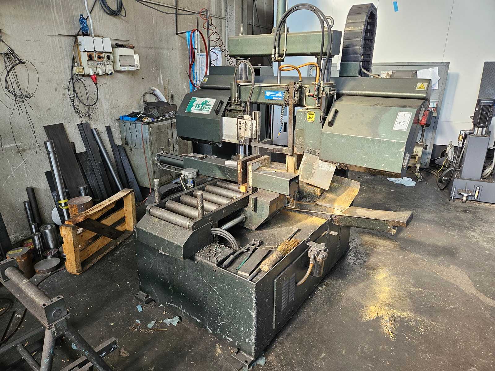 Angebot 25359 Technische Daten: Schnittbereich bei 90° rund 250 mm - flach 275 x 180 mm - Gehrungsverstellbar links Schnittb. bei 45° rund 200 mm - Schnittb. bei 45° flach 190 x 180 mm - Schnittb. bei 30° flach 130 x 110 mm - Materialauflagehöhe ca. 920 mm Sägebandabmessung 3100 x 27 x 0,9 mm Schnittgeschwindigkeit stufenlos 15 bis 100 m/min hydr. Heben – Senken des Sägerahmens obere Hubbegrenzung des Sägerahmens Schnittdruck stufenlos regulierbar 0 - 10 m/min hydr. Materialspannstock Mikrosprüh - Kühlmitteleinrichtung - Gesamtantriebsleistung 400 V / 2,2 kW - Platzbedarf ca. B 2400 x H 1600 x T 1800 mm - Gewicht ca. 1300 kg - 3 x Rollengang 1500 mm
