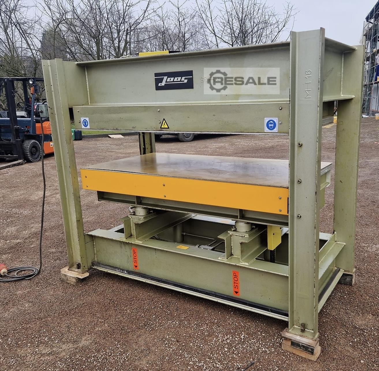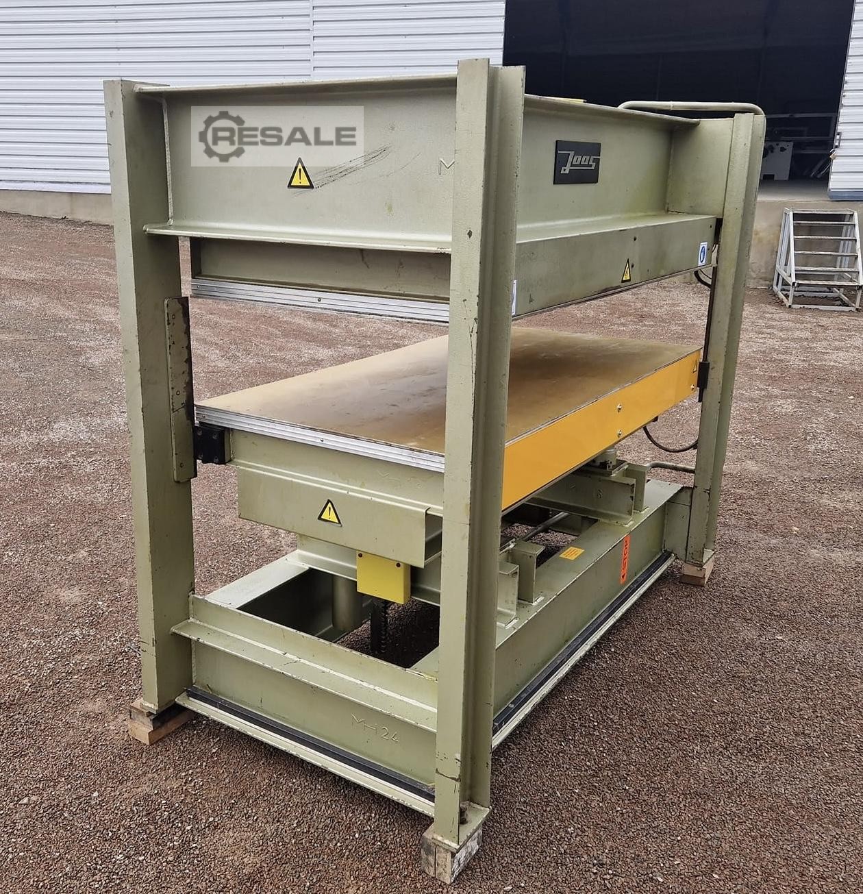 Gebrauchte Joos HP90. Pressfläche: 2500mm x 1250mm; Öffnung: 360mm; Heizung Platte oben: elektrisch; Heizung Platte unten: defekt; Plattenoberfläche: ALU - eoxiert; Pressdruck: 90t; Anzahl der Zylinder: 4; Stromaufnahme: ca. 33A; Maschinenlänge: 3000 mm; Maschinenbreite: 1500mm; Gewicht: 4000kg;