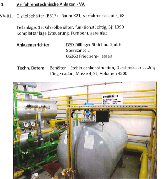 1. Verfahrenstechnische Anlagen - Glykol-Tank (B617) Teilanlage, 1 Glykoltank, voll funktionsfähig, Baujahr 1990 Komplettes System (Steuerung, Pumpen), gereinigt System-Installer: DSD Dillinger Stahlbau GmbH Technische Daten: Tank – Stahlblechkonstruktion, Durchmesser ca. 2m; Länge ca. 4m; Gewicht 4,0 t; Volumen 4800 l Mehr dazu finden Sie hier - / Kontaktieren Sie uns unter -