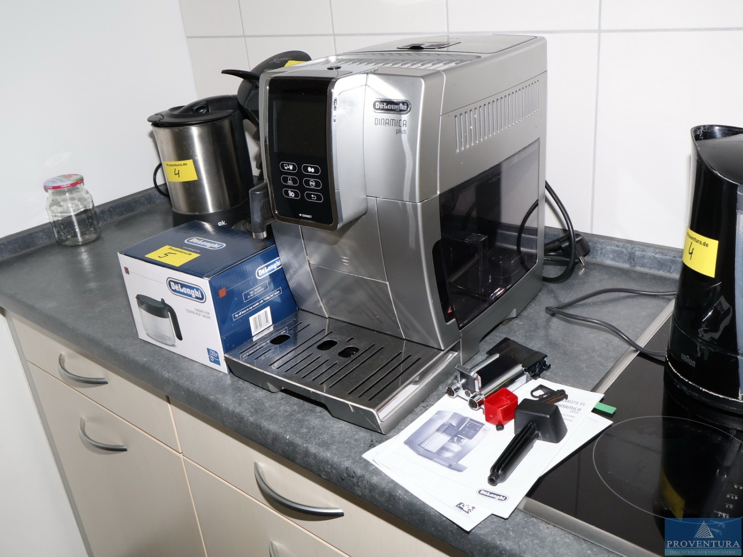 Kaffeevollautomat DELONGHI Dinamica Plus, Typenschild nicht einsehbar, 25.064 Tassen (18.03.25), Auslauf nach Reinigung zerlegt, Vollständigkeit nicht geprüft, Kanne