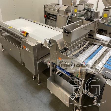 gebrauchte Brötchenanlage Kemper Quadro 5-reihig, überholt, mit Kopfmaschine (245 cm lang), doppelter Bestreuung (330 cm lang) und Absetztisch (300 cm lang), Breite der Anlage: 125 cm, Kopfmaschine: No. 93228, Art.-Nr. 650010, 16 A, 400 V, 500 Hz