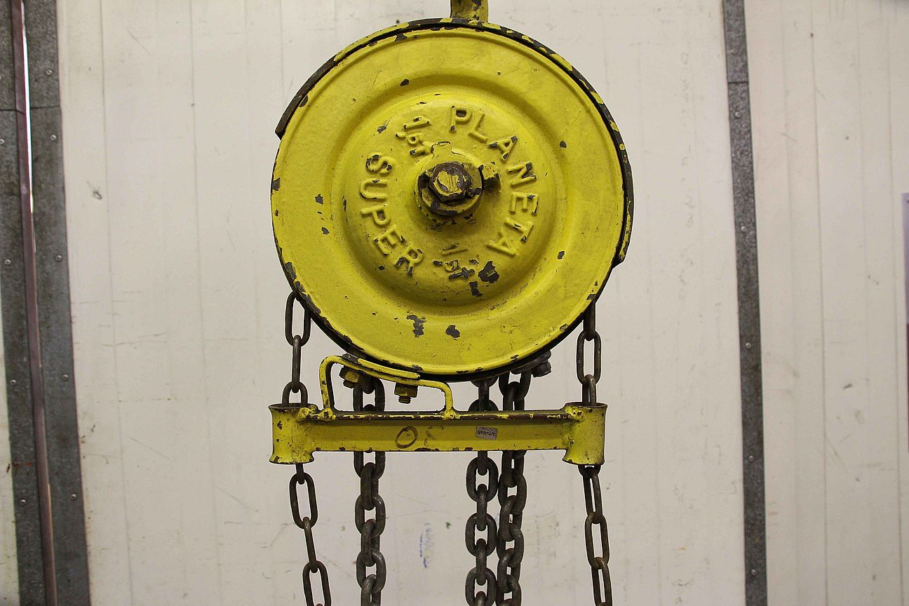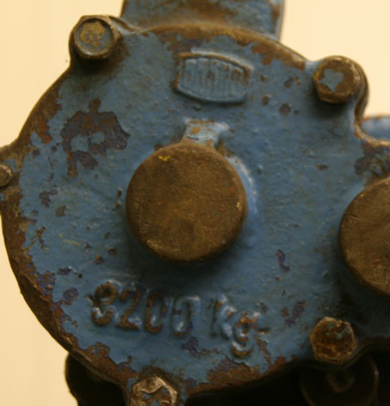 Stirnradflaschenzug, Stirnradfkettenzug, Hand-Kettenzug, Hebelzug, Kettenzug, Kran, Montagezug, Montagekettenzug, Handfahrwerk, Rollfahrwerk, Krankatze, Katzlaufwerk, Kranlaufwerk, Kranfahrwerk, Laufkatze, Unterflanschlaufkatze -Tragkraft: 5000 kg -Hubweg: 4,0 m -Abmessunge: 500/400/H800 mm -Gewicht: 165 kg