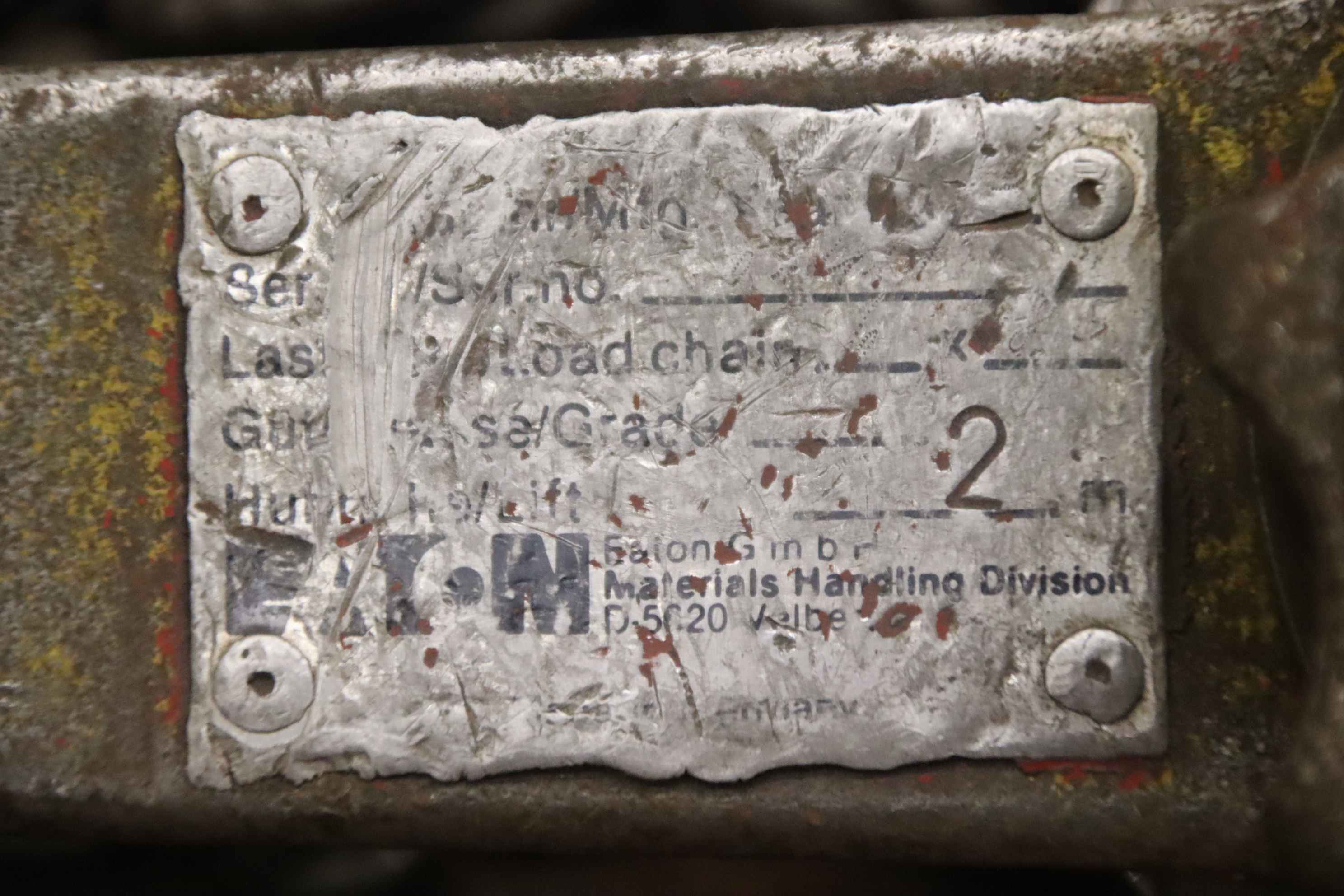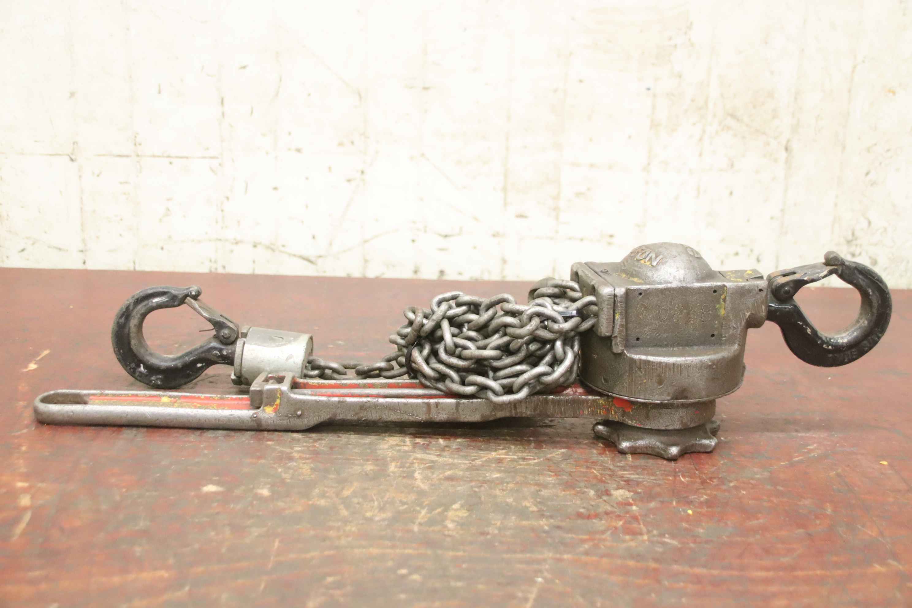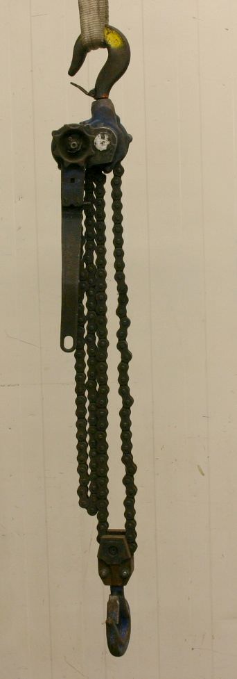 Stirnradflaschenzug, Stirnradfkettenzug, Hand-Kettenzug, Hebelzug, Kettenzug, Kran, Montagezug, Montagekettenzug, Handfahrwerk, Rollfahrwerk, Krankatze, Katzlaufwerk, Kranlaufwerk, Kranfahrwerk, Laufkatze -Tragkraft: 1000 kg -max. Hubweg: 4800 mm -Abmessungen: 280/600/H190 mm -Gewicht: 38 kg