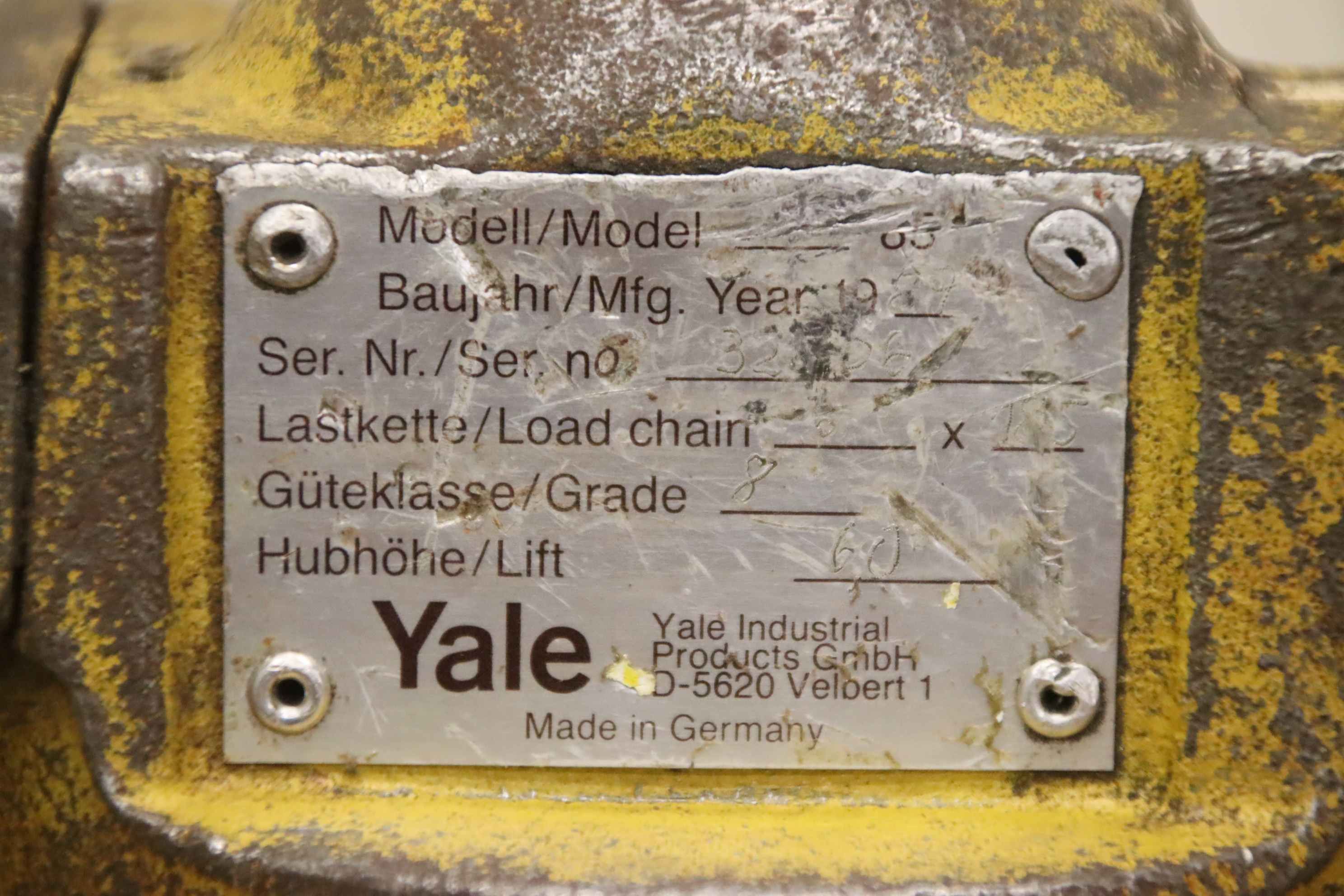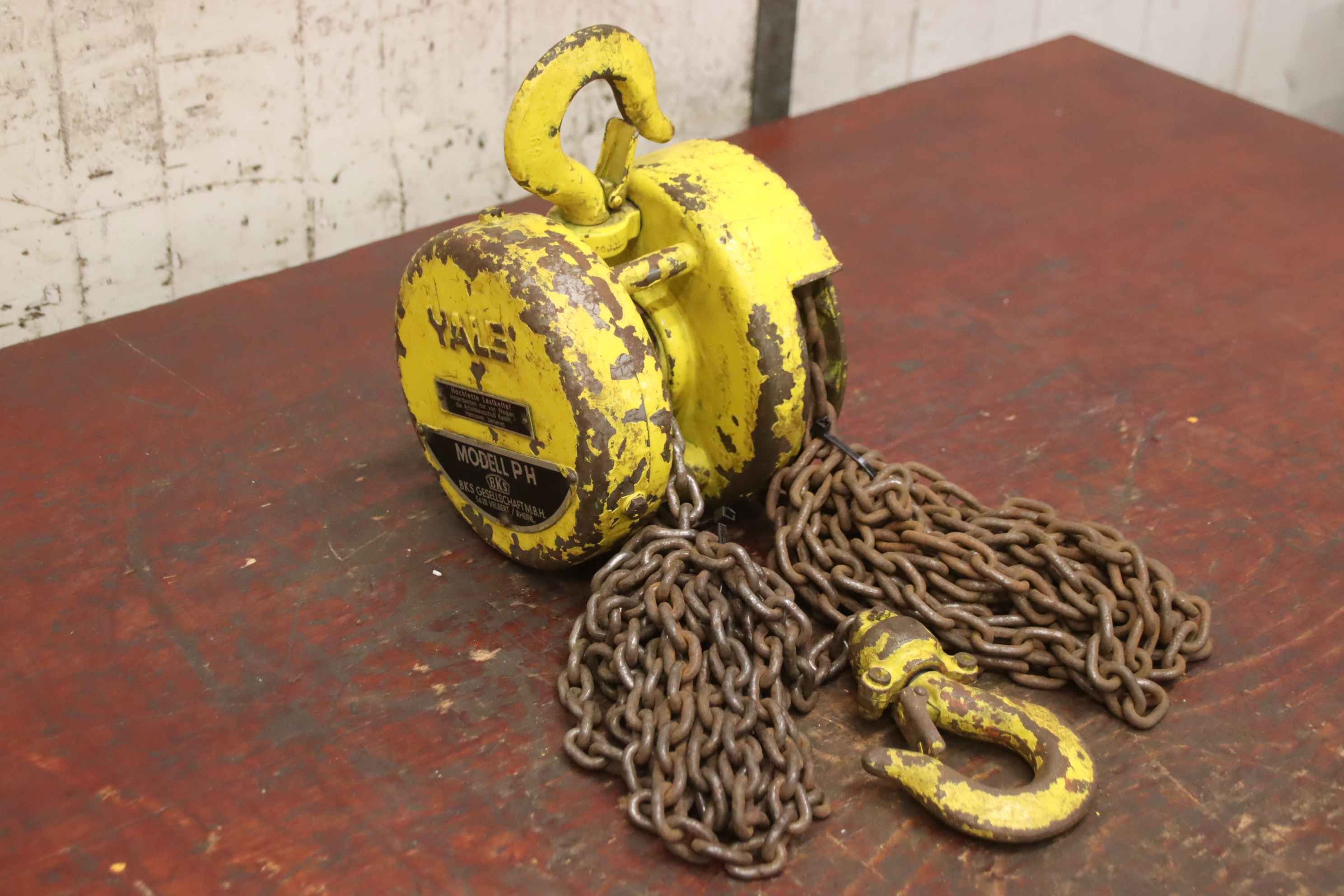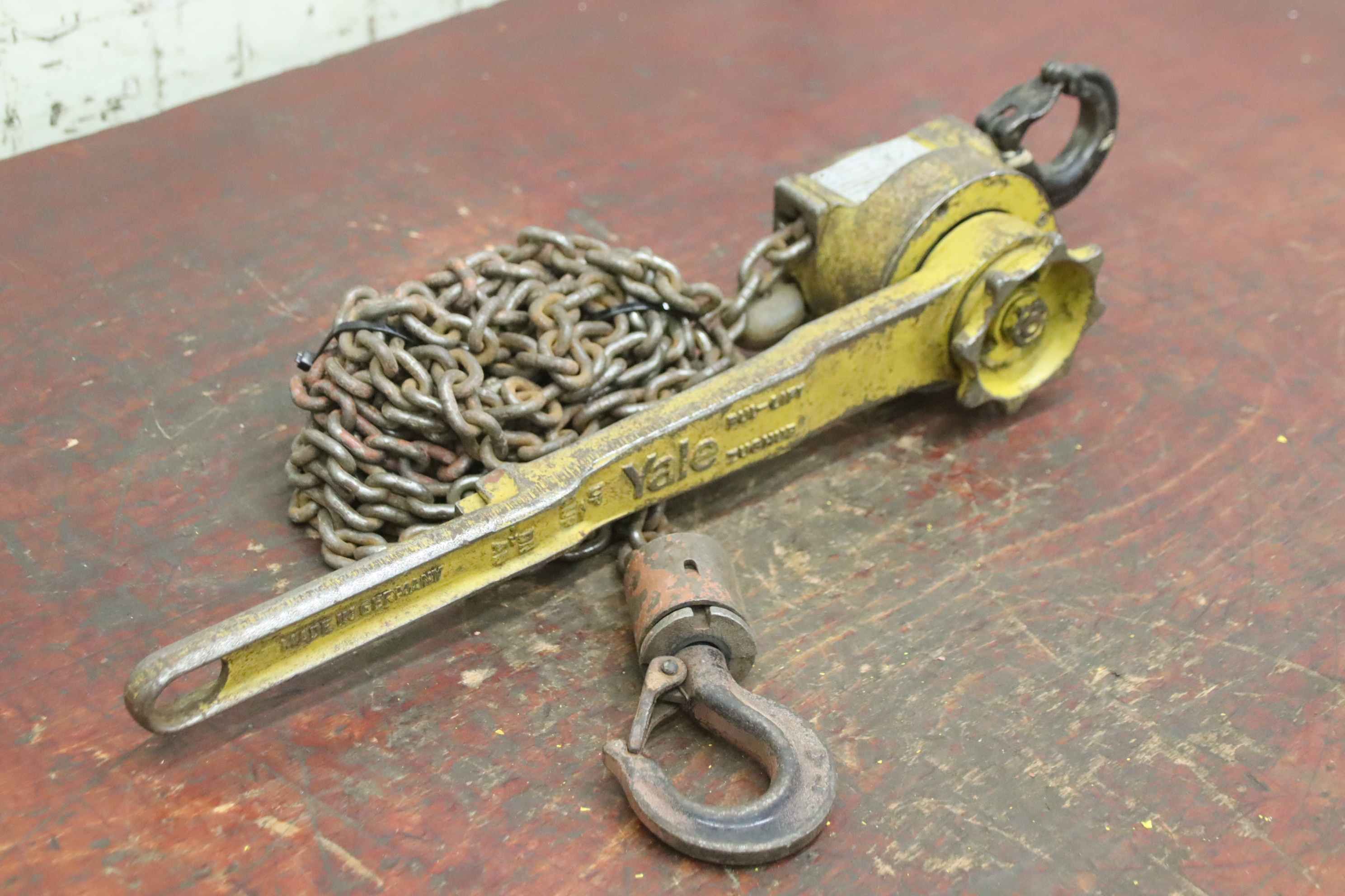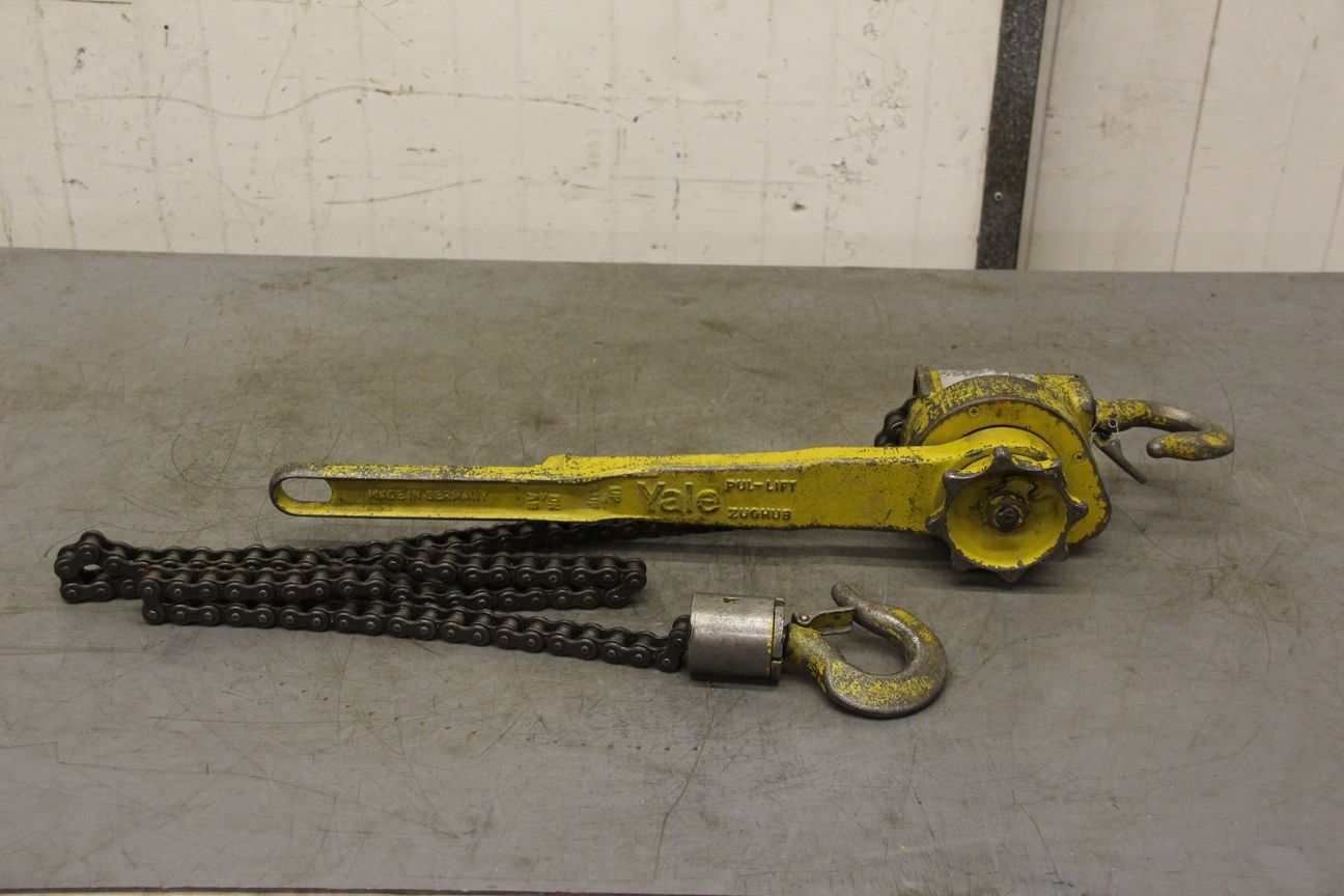 Hebelzug, Kettenzug, Kran, Montagezug, Montagekettenzug, Stirnradflaschenzug -Hersteller: Yale, Kettenzug Stirnradflaschenzug -Tragkraft: 1/2 Ton -Kettenlänge:3,36 m -Anzahl: 1 Stück -Transportabmessungen: 360/165/H250 mm -Gewicht: 13,1 kg