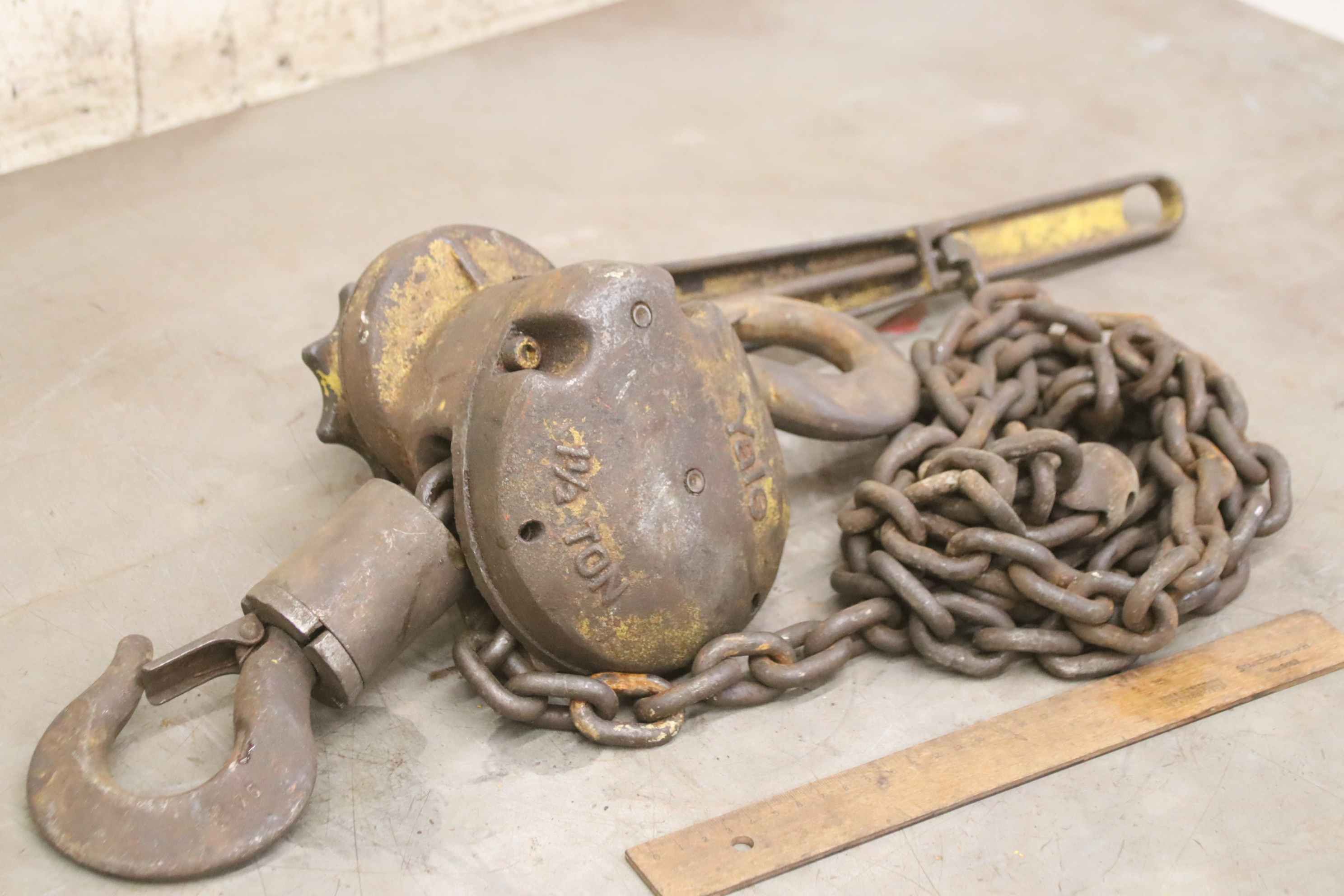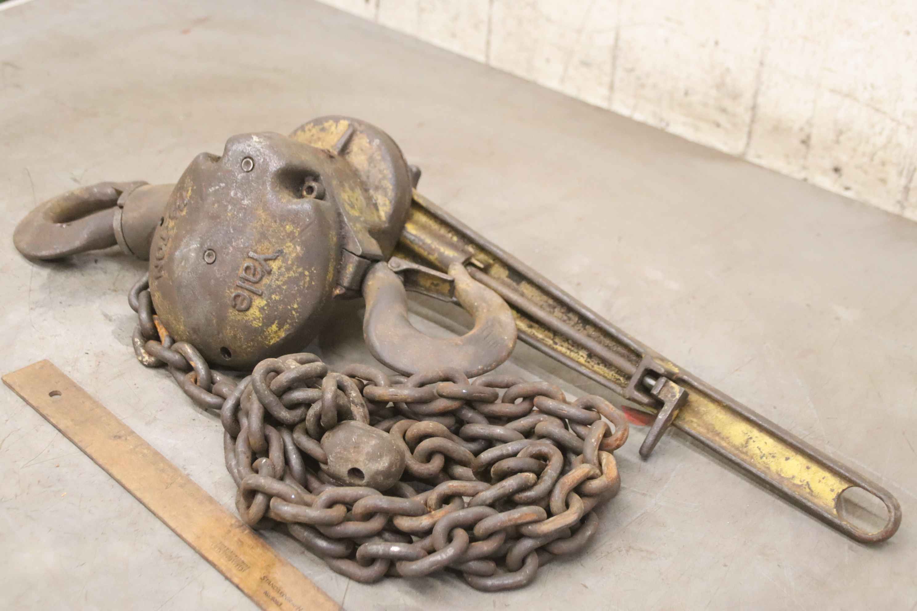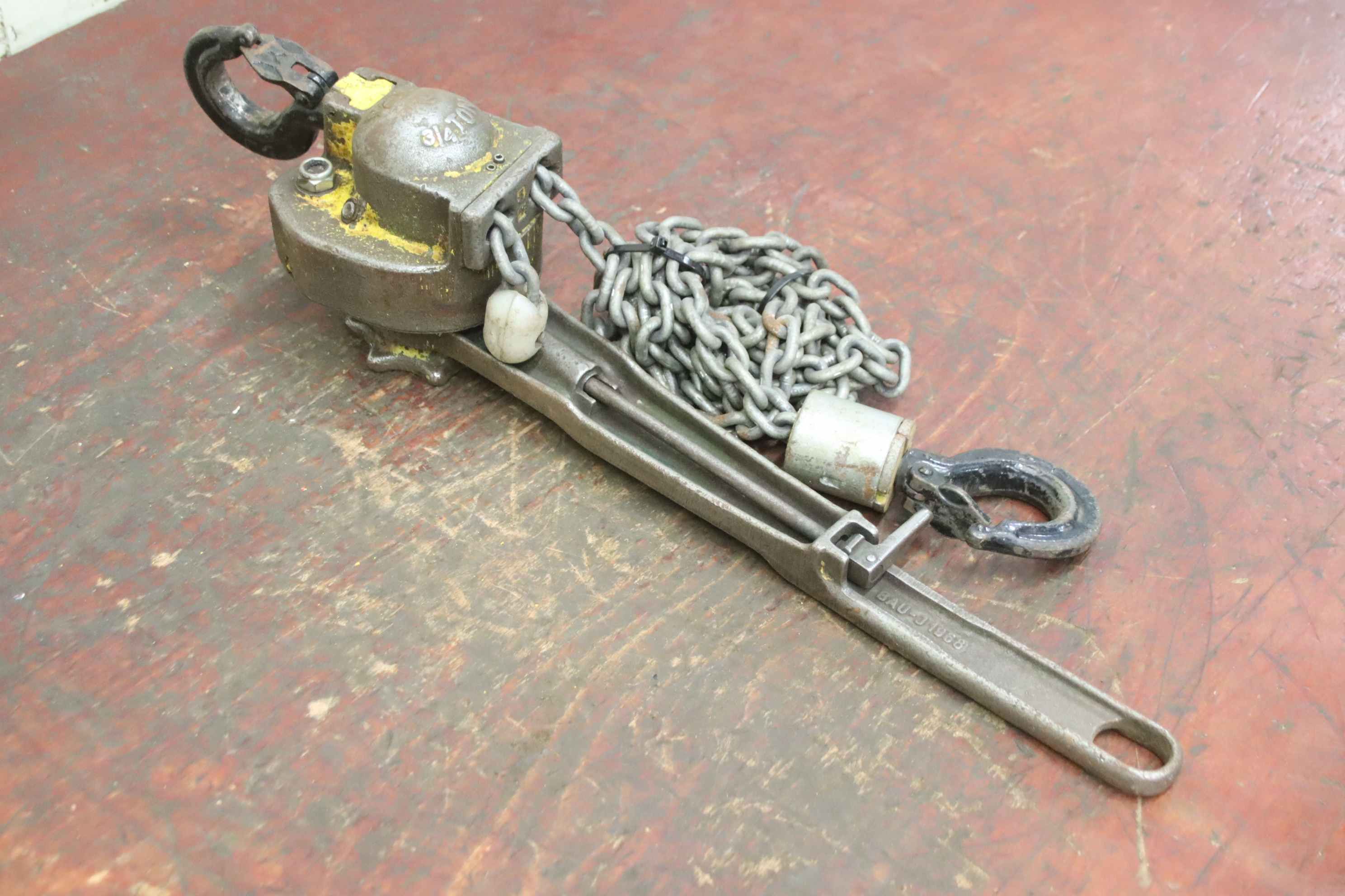 Hebelzug, Kettenzug, Kran, Montagezug, Montagekettenzug -Hersteller: Yale, Hebel-Kettenzug -Tragkraft: 3/4 Ton -Kettenlänge: 2,54 m -Anzahl: 1 Stück -Abmessungen: 600/130/H150 mm -Gewicht: 8,9 kg