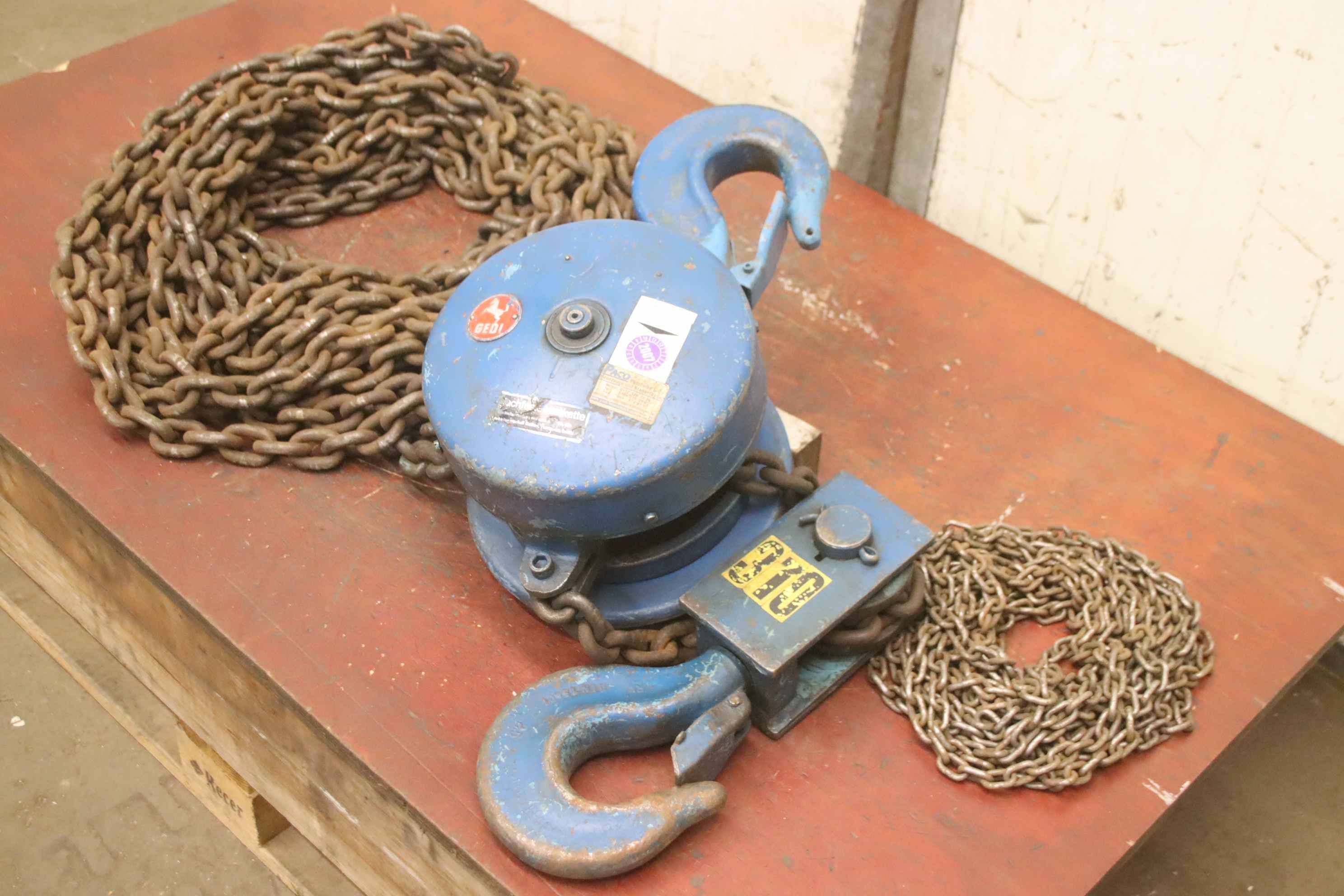 Hebelzug, Kettenzug, Montagezug, Montagekettenzug, Flaschenzug, Stirnradflaschenzug -Hersteller: GEDI, Kettenzug -Tragkraft: 3 To -Hakenweg: 10 m -Transportabmessungen: 700/600/H350 mm -Gewicht: 114 kg