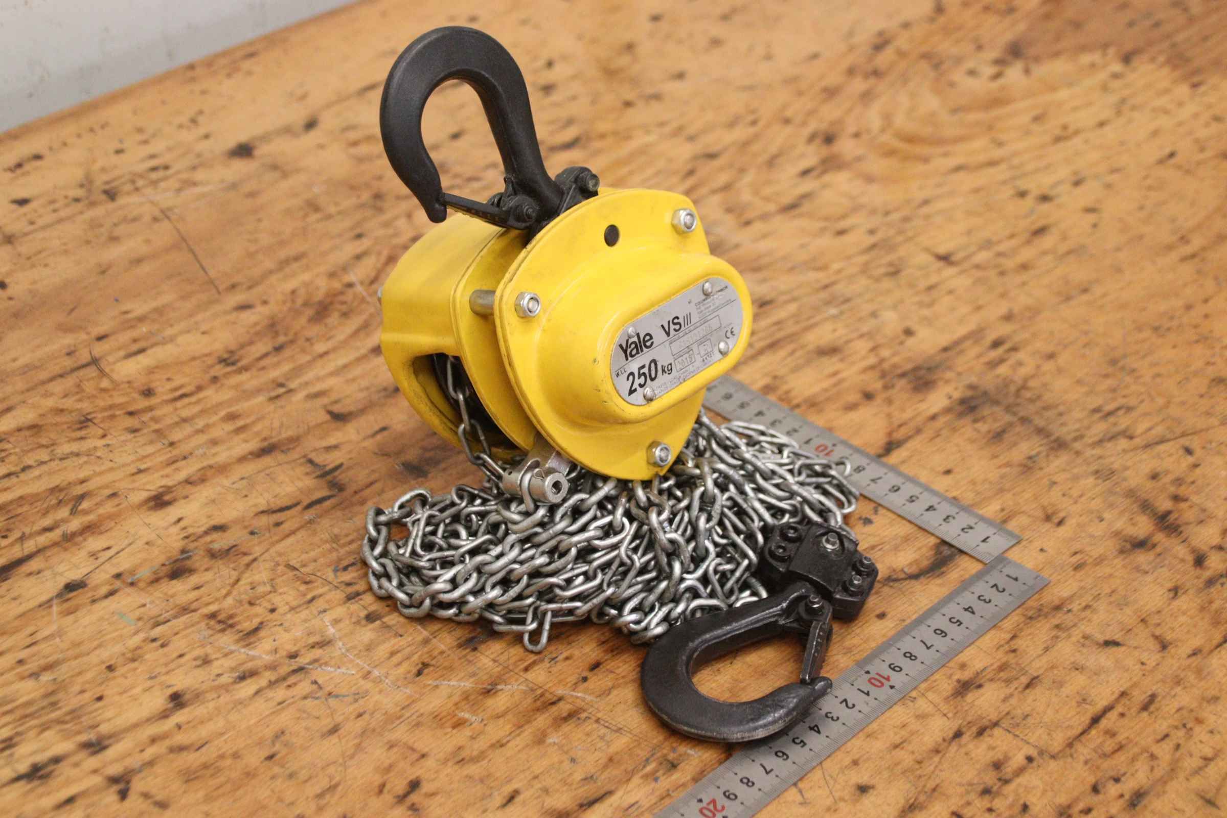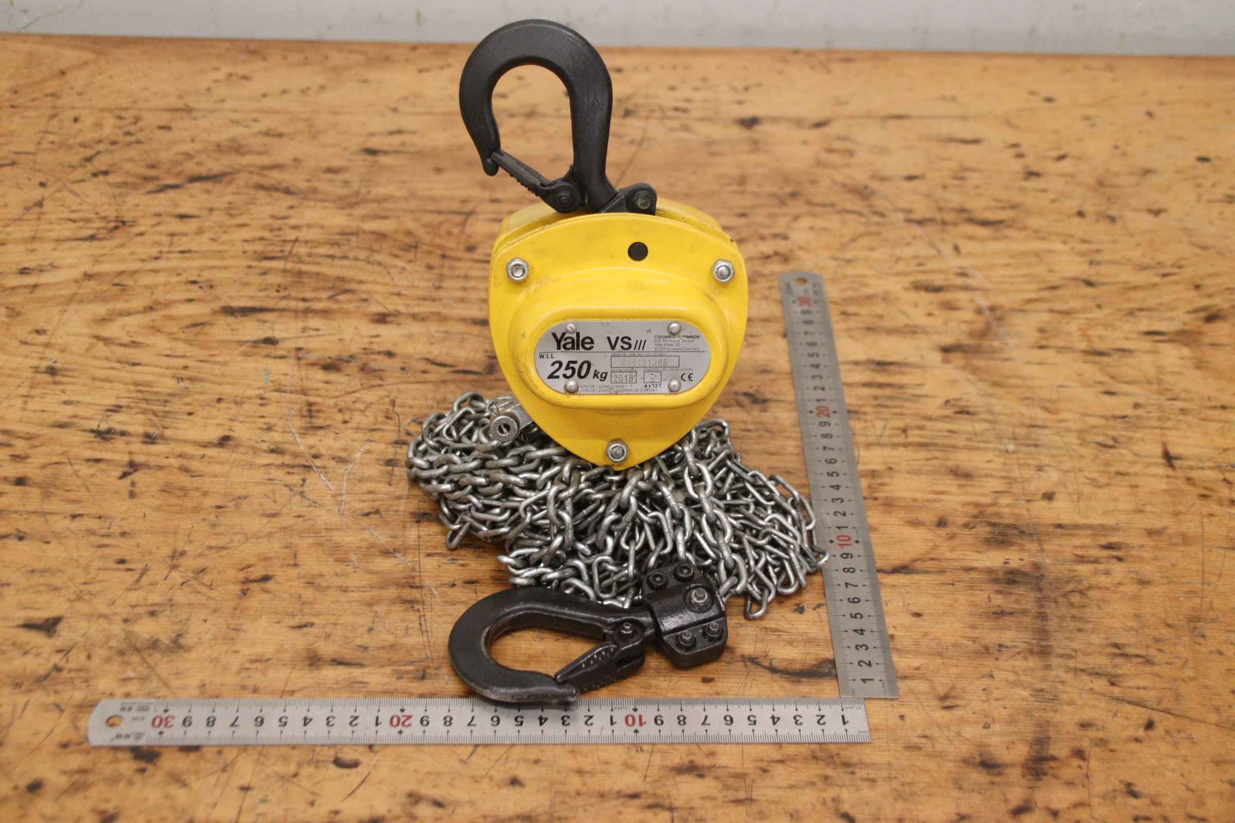 Hebelzug, Kettenzug, Kran, Montagezug, Montagekettenzug, Stirnradflaschenzug -Hersteller: Yale, Kettenzug Stirnradflaschenzug Typ VS -Tragkraft: 250 kg -Kettenlänge:3 m -Anzahl: 1 Stück -Transportabmessungen: 350/180/H120 mm -Gewicht: 4,9 kg