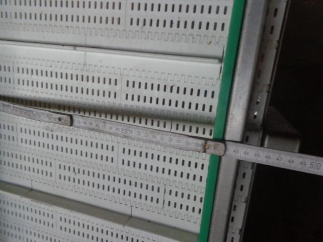 gebrauchtes Kettenförderband Hersteller: BOA Typ: 1500 HG 29°HTK 11770 Baujahr: 1997 Technische Daten zum Kettengurtförderband: Antriebsleistung 3 kW Länge Aufgabeband 650 mm Länge Steigband 10770 mm Steigung 29° Nutzbreite 1400 mm Höhe Antriebsache über Grund 4.260 mm Höhe Seitenwand Steigband, innen 800 mm