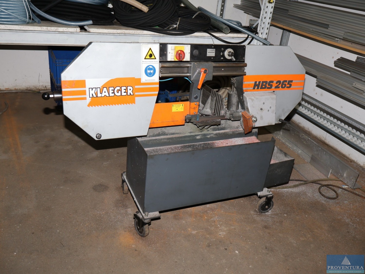 Horizontal-Bandsäge KLAEGER HBS265 Bj. 2006, S/N 133473, max. Werkstückhöhe ca. 265 mm, rollbar, wird mittels 2 to Kettenhebezug durch Decke gehoben