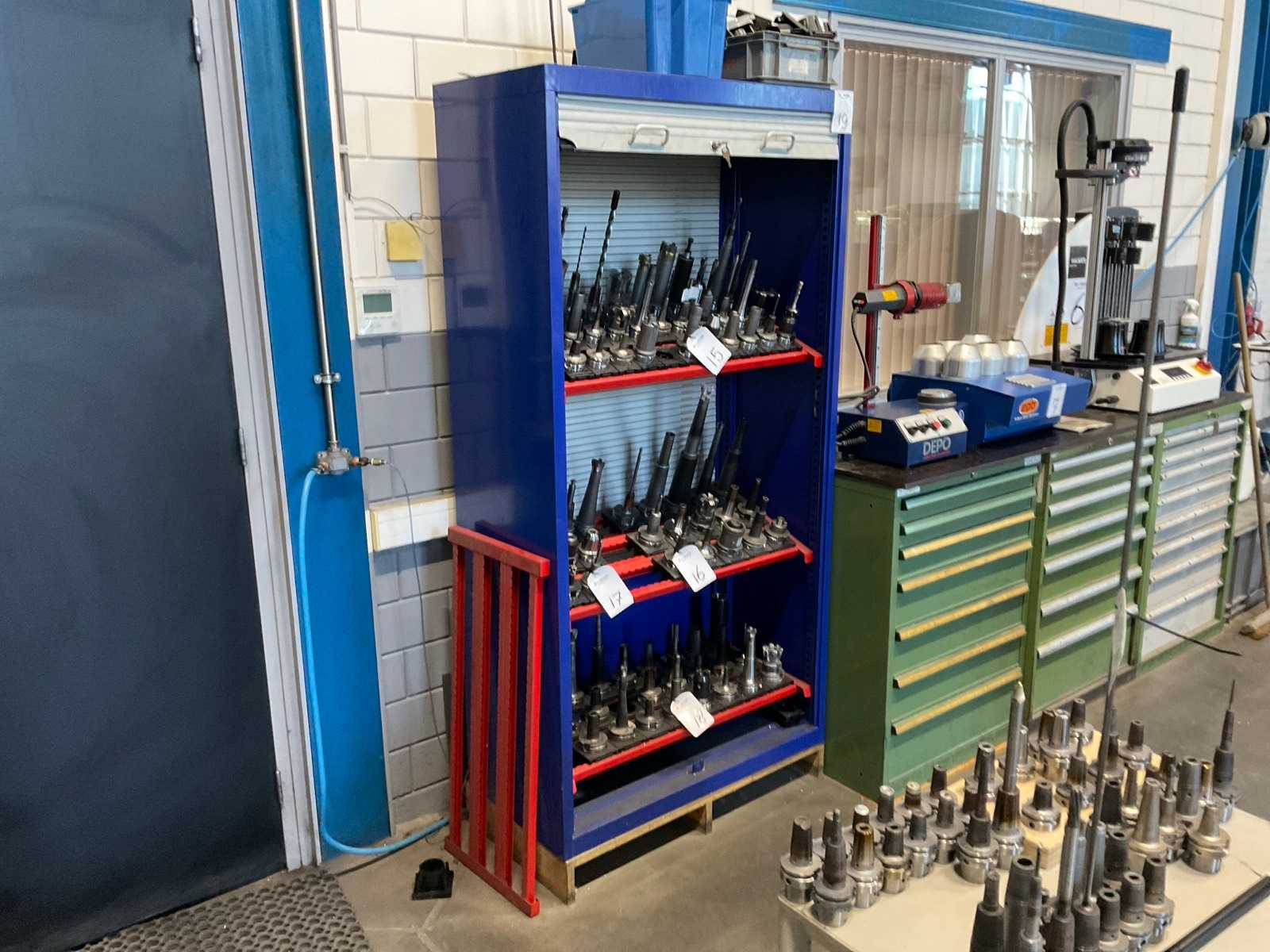 Schrank mit ISO-50-Werkzeughaltern Typ: Werkzeugaufbewahrungsschrank mit ISO-50-Werkzeughaltern Seriennummer: Nicht sichtbar Werkzeugtyp: ISO 50 Inhalt: Verschiedene ISO-50-Werkzeughalter und Zubehör Abmessungen: ca. 750 x 600 x 1000 mm (L x B x H) Nicht getestete Funktionalität Dieser Artikel wird beladen auf einem LKW geliefert. Abbau- und Verladekosten sind als zusätzliche Kosten angegeben. Auktions-ID: A1-45225-34