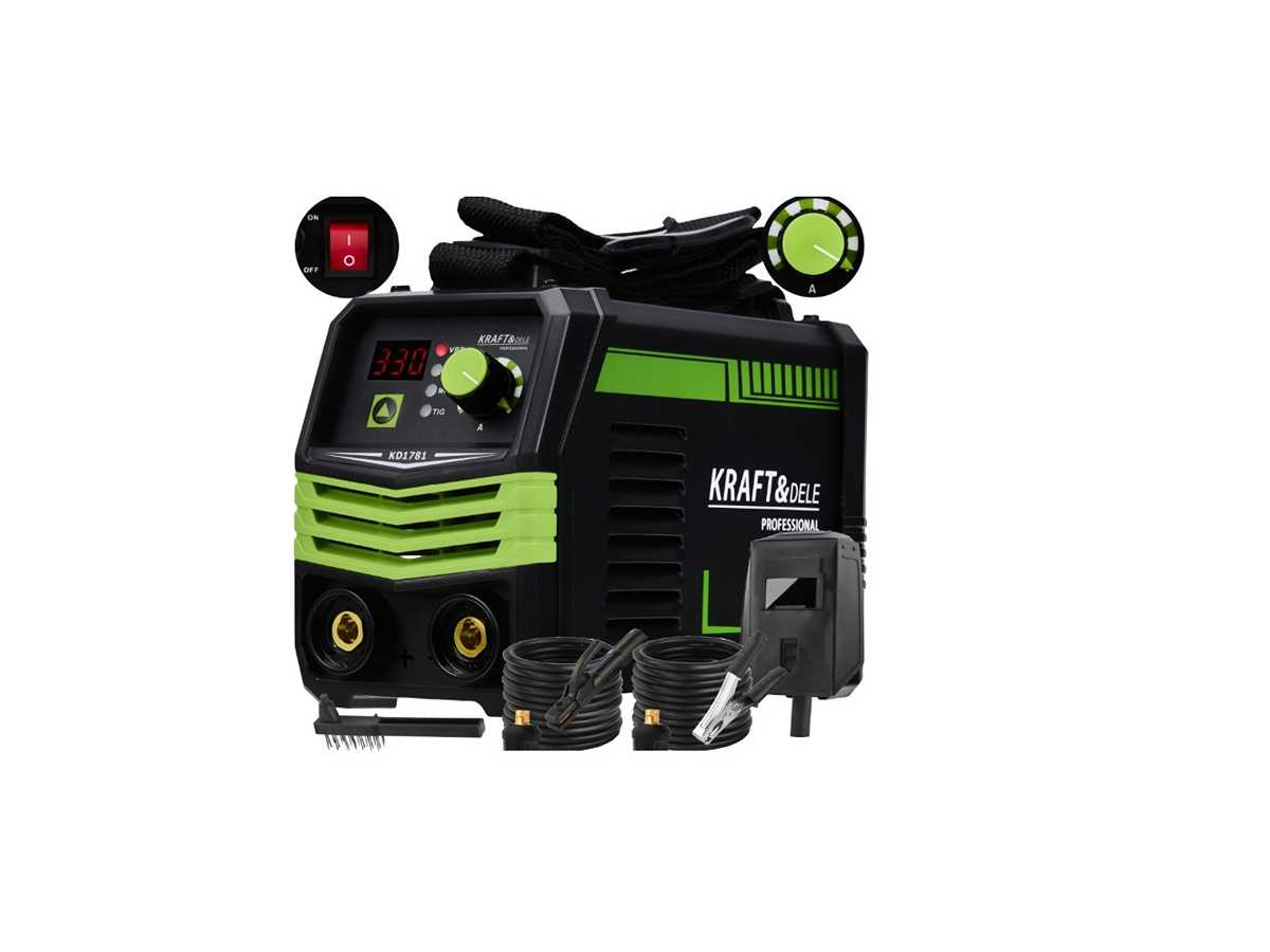 Professionelle MMA 330A Inverter-Schweißmaschine Marke: KRAFT&DELE Merkmale: . MMA- und TIG-LIFT-Schweißen . Maximaler Lötstrom 330A . Unendlich variable Schweißstromregelung . VRD-System für erhöhte Sicherheit am Arbeitsplatz . Unterstützt Elektroden von 1,6 bis 5,0 mm . Stabiler Bugbetrieb . Lüfterkühlung . Schultergurt – leichter Transport Technische Daten: . Eingangsspannung 230 V . Frequenz 50 Hz / 60 Hz . Maximaler Schweißstrom 330 A . Stromregelungsbereich 20 – 330 A . Elektrodenbereich 1,6 – 5,0 mm . Leistung 85 % . Lüfter des Kühlsystems . Schutzgrad IP21S . Isolierungsgrad F Zustand: Neu