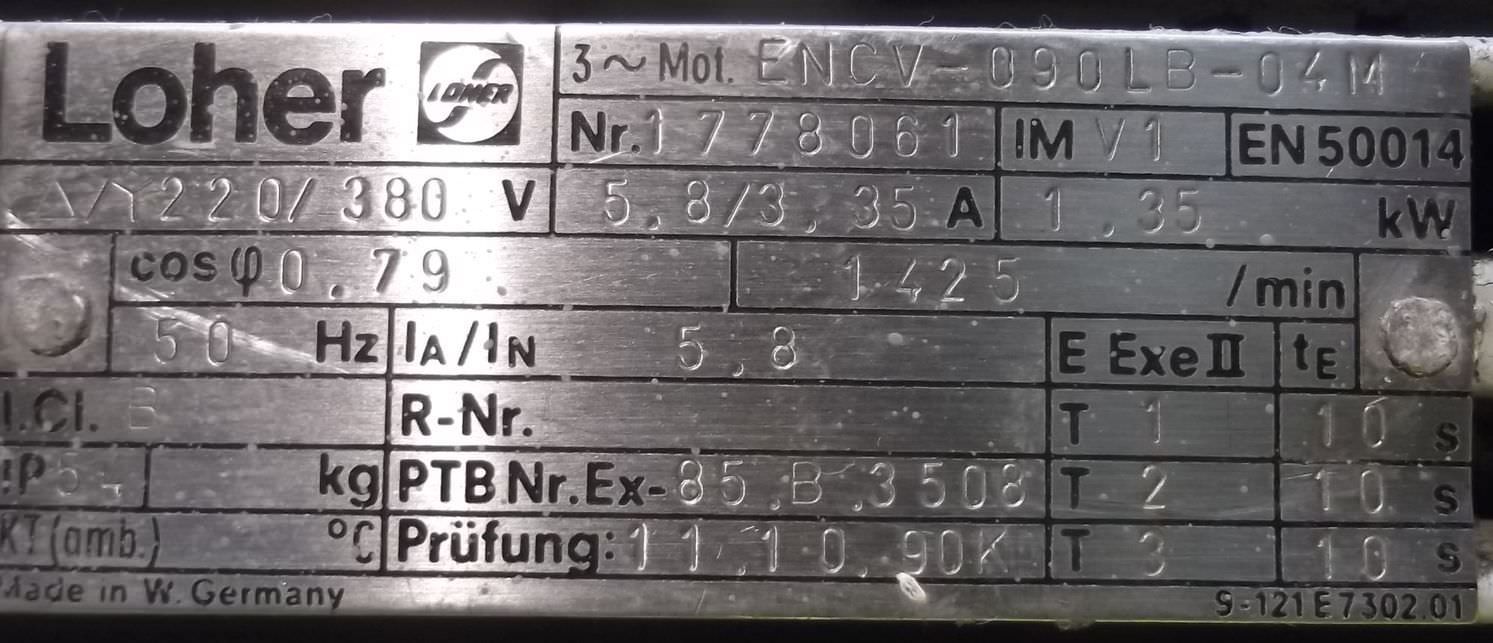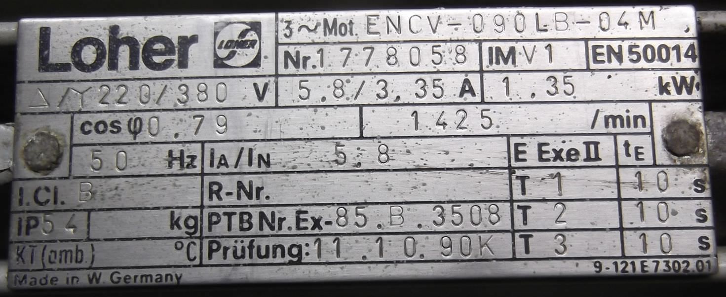 Maschinentyp: Elektromotor 1,35 kW 1425 U/min Ex