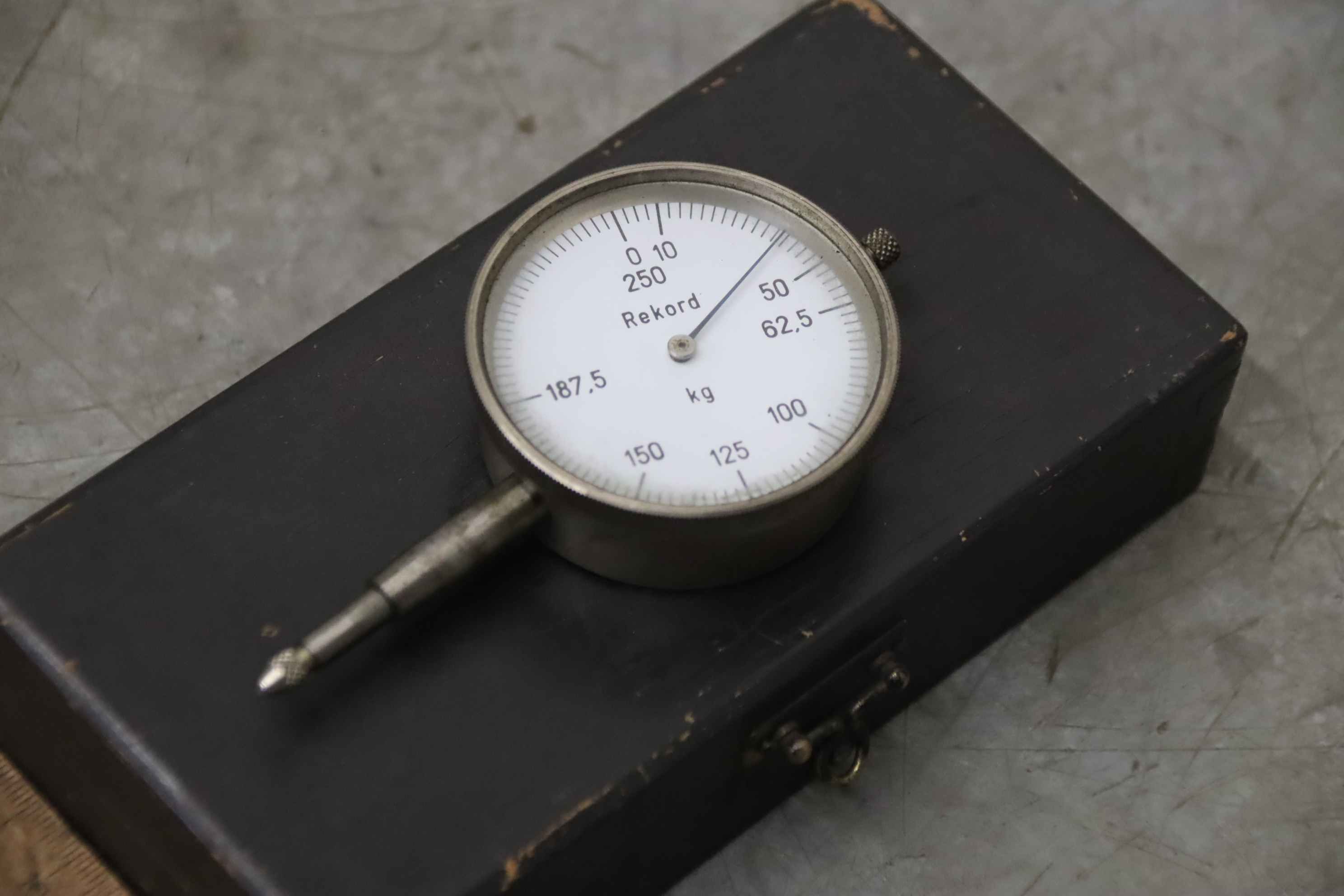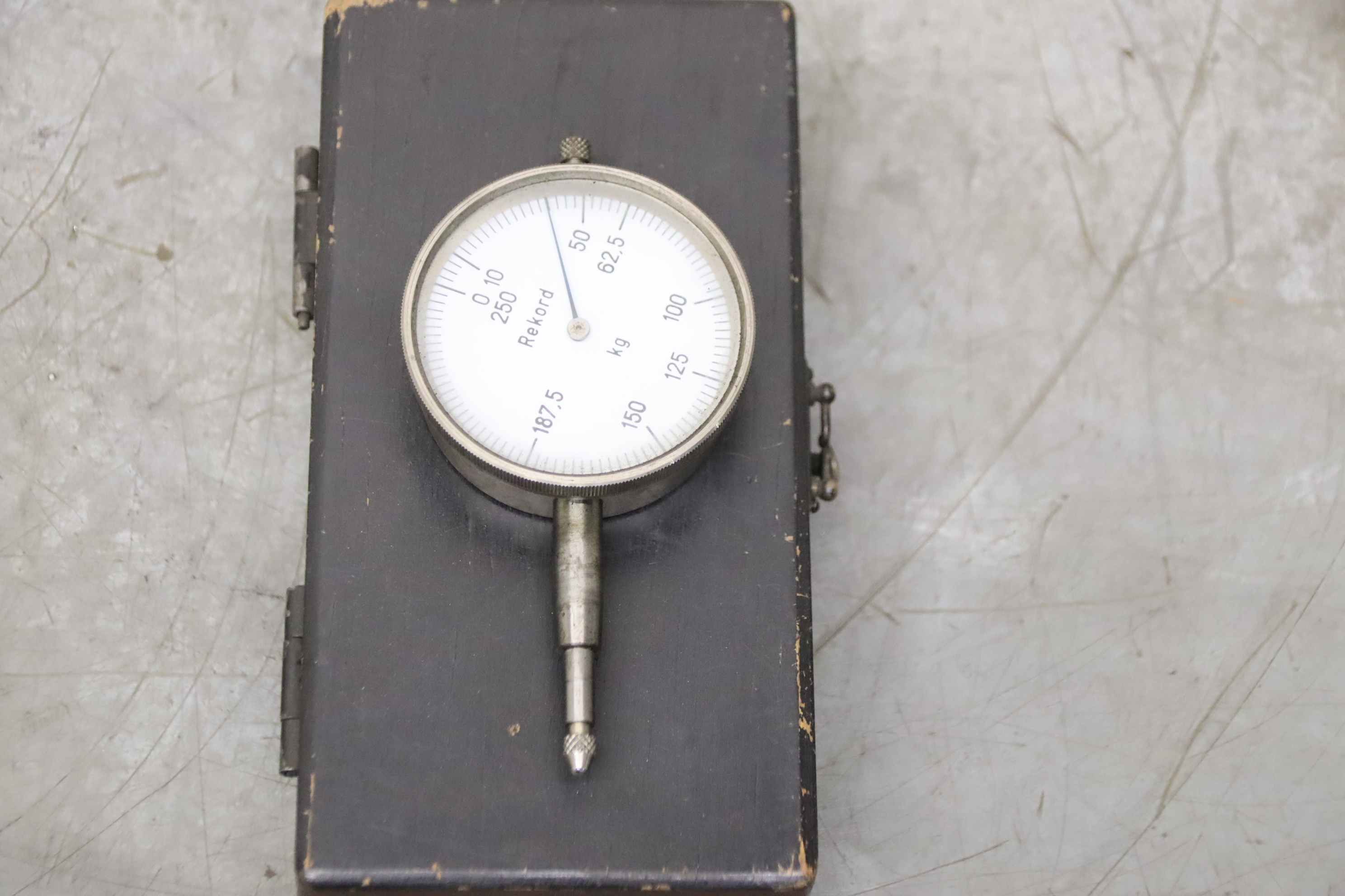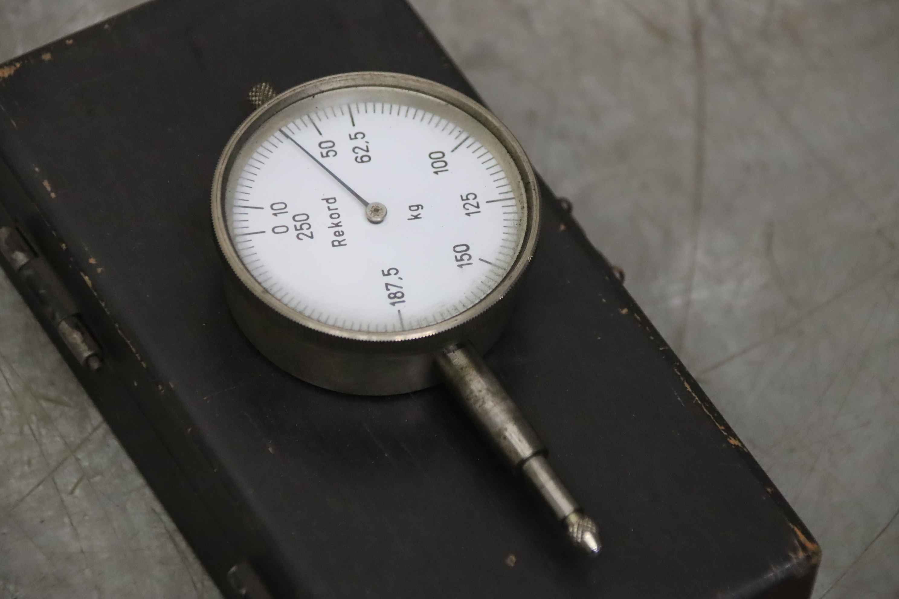 Fühlhebelmeßgerät, Meßuhr, Messtaster, Meßtaster -Hersteller: Rekord, Meßuhr Gewicht -Meßbereich: 0 - 250 kg -Abmessung Etui: 160/80/H35 mm -Gewicht: 0,4 kg