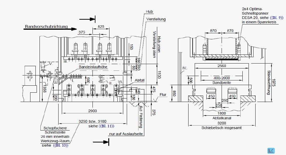 Blechbreite: 2000 mm Blechstärke: 1.8 mm Steuerung: SIEMENS S7 PRESSEN-BAUART: . - Gestellbauart : Zweiständer : . - Fenster im Seitenständer : ja : . - Durchfall-Loch im Tisch : ja : . - Schiebetisch : ja : . PRESSENTISCH: . - Aufspannfläche (links-rechts): 2800 mm - Aufspannfläche (vorne-hinten): 2800 mm - Höhe über Flur: 375 mm STÖSSEL: . - Stösselkraft: 800 to - Aufspannfläche (links-rechts): 2800 mm - Aufspannfläche (vorne-hinten): 2800 mm - Hub: 350 mm - Hubzahl max.: 55 /min STÖSSEL (MECHAN. PRESSE): . - Stössel-Verstellbarkeit: 350 mm WERKZEUG-EINBAUABMESSUNGEN: . - Werkzeug-Einbauhöhe (Hub unten, Verstellung o: 1100 mm - Abstand zw. den Ständern (links-rechts): 3100 mm - Freier Durchgang seitlich (Breite): 2560 mm - Freier Durchgang seitlich (Höhe): 1500 mm BANDABROLLEINHEIT: . - Bauweise : Einfachhaspel : . - Blechbreite (max): 2000 mm - Blec ...