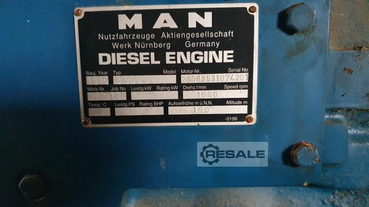 Gebrauchte MAN D2565 ME. MAN Diesel (Notstrom) D2565 ME Diesel Stromerzeuger von 1977 mit 402 Betriebsstunden, mit, Schalldämpfer und Kühlung aber ohne Steuerung und Tagestank. 1 verfügbar 80 KWel x 1.500 U/min, 400 V/50 Hz. AC-Generator: Leroy Somer TA 2252L11, 100 KVA Gasmotor MAN D2565 ME Hersteller: MAN Modell: D2565 ME Typ: Diesel Notstrom Seriennummer: 383045/53 Leistung [KW]: 92 Baujahr: 1977 Betriebsstunden: 402 Gewicht Aggregat [kg]: 1.670 Abmessungen LxBxH [cm]: 250 x 80 x 180 AC-Generator Leroy Somer Hersteller: Leroy Somer Modell: TA 2252L11 Typ: AC-Synchron-Generator Seriennummer: 84922,2 Leistung [KVA]: 100 Spannung [V]: 400 Frequenz [Hz]: 50 Strom [A]: 152 Drehzahl [1/min]: 1.500 Baujahr: 1977 Gewicht [kg]: 560