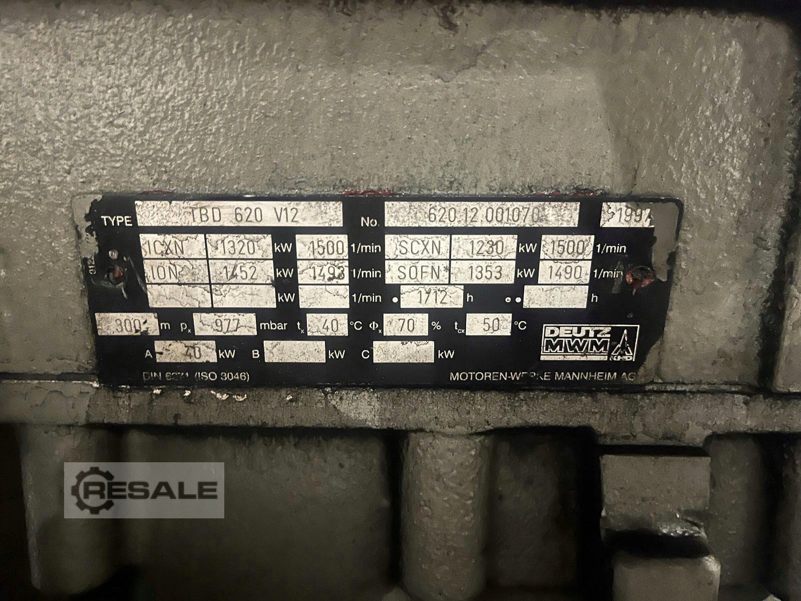 Gebrauchte MWM TBD602-V16. MWM Notstromaggregat TBD602-V16 Diesel-Notstromaggregat von 1980, Betriebsstunden sind unbekannt, komplett mit Steuerung, Schalldämpfer, Kühler, Ausgleichsbehälter und Tagestank. 1 verfügbar ab 04/24 624 KWel x 1.500 U/min, 400 V/50 Hz. AC-Generator: AVK DIDB 120/1109/40, 780 KVA Hersteller: MWM Modell: TBD602-V16 Typ: Diesel-Stromaggregat Seriennummer: 80 79 53 Leistung [KW]: 750 Baujahr: 1980 Betriebsstunden: unbekannt AC-Generator AVK DIDB 120/1109/40 Hersteller: AVK Modell: DIDB 120/1109/40 Typ: AC-Synchron-Generator Seriennummer: 807953 Leistung [KVA]: 780 Spannung [V]: 10.000 / 5.770 Frequenz [Hz]: 50 Strom [A]: 51 Drehzahl [1/min]: 1.500 Baujahr: 1980