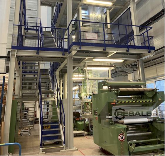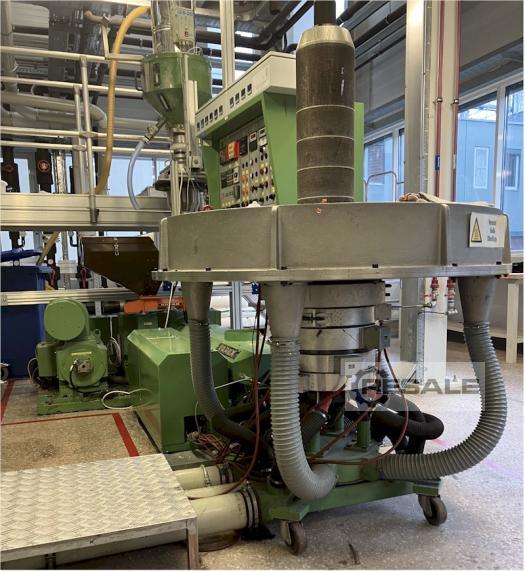 Gebrauchte Windmoeller + Hoelscher Blownfilm 60/1300. Folienextrusionsanlage: Laboranlage mit nur 7000 Bertriebsstunden. Die komplette Anlage ist von W&H (Windmöller & Hölscher). Der Wickler ist von Fa. A/S Svend Knudsen Maschinenfabrik Sämtliche Heizungsregler sind vor 4 Jahren erneuert worden. Extruder: 60/30D , Materialien: PE und PP , Ausstoß: bis 100kg/h , Düsendurchmesser: 200mm , Düseneinsätze für Lippenspalt von: 1.0, 1.2, uns 2.0mm , Gebläse für Innen- und Außenkühlung, IBC (InnerBubbleCooling) Abzugsgeschwindigkeit bis 100m/min , Folienbreite: 600mm bis 1300mm , Wickler: Fabrikat: Falcon MSG1200/1 Wickler mit 2 Wickelstationen, Wickelwellen: 3" . komplette, massive Bühne: 3 Etagen, alle Teile verschraubt. (nichts geschweißt!)