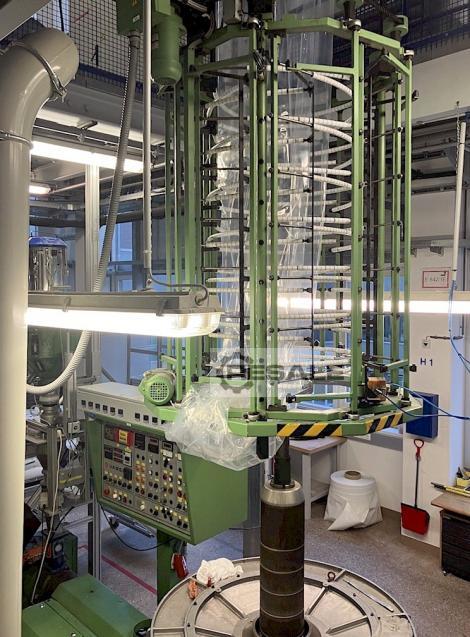 Gebrauchte Windmöller & Hölscher Blownfilm 60/1300. Folienextrusionsanlage: Laboranlage mit nur 7000 Bertriebsstunden. Die komplette Anlage ist von W&H (Windmöller & Hölscher). Der Wickler ist von Fa. A/S Svend Knudsen Maschinenfabrik Sämtliche Heizungsregler sind vor 4 Jahren erneuert worden. Extruder: 60/30D , Materialien: PE und PP , Ausstoß: bis 100kg/h , Düsendurchmesser: 200mm , Düseneinsätze für Lippenspalt von: 1.0, 1.2, uns 2.0mm , Gebläse für Innen- und Außenkühlung, IBC (InnerBubbleCooling) Abzugsgeschwindigkeit bis 100m/min , Folienbreite: 600mm bis 1300mm , Wickler: Fabrikat: Falcon MSG1200/1 Wickler mit 2 Wickelstationen, Wickelwellen: 3" . komplette, massive Bühne: 3 Etagen, alle Teile verschraubt. (nichts geschweißt!)