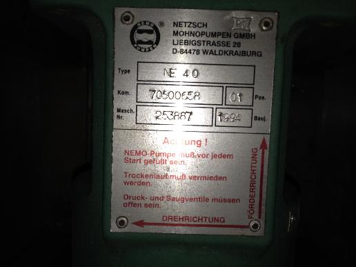 Gebrauchte Netzsch Nemo 4NE15A. Gebrauchte Exzenterschneckenpumpe Nemo-Pumpe-Aggregat 4NE15A Baujahr: 1997 Bauform: IMB3 Leistung: 0,75 KW Spannung: 230/400 V Drehzahl: 624 U/min Maschinen-Nr.: 284285 Drehrichtung: nach links, auf Antriebswelle gesehen