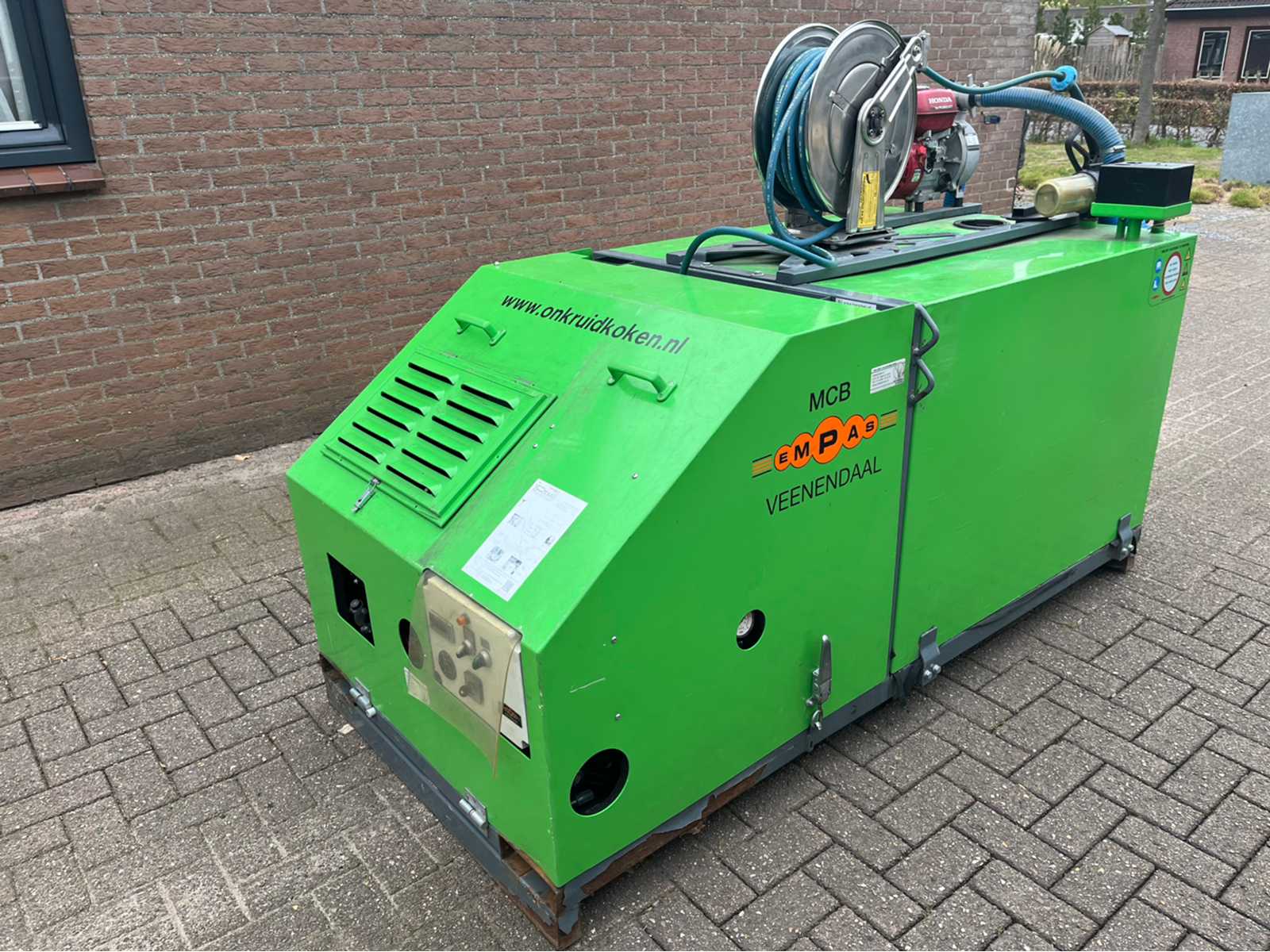 Empas MCB 1000 – in gutem Zustand Nur 771 Arbeitsstunden Heißes Wasser bis maximal 108°C Maximaldruck: 150 bar Wasserausbeute: 12 Liter/min Ausgestattet mit Wasserenthärtungssystem (flüssig und elektronisch) 1000-Liter-Speichertank Füll-/Zuführpumpe: Honda, 620 Liter/min Elektrischer Start Auktions-ID: A1-40134-71
