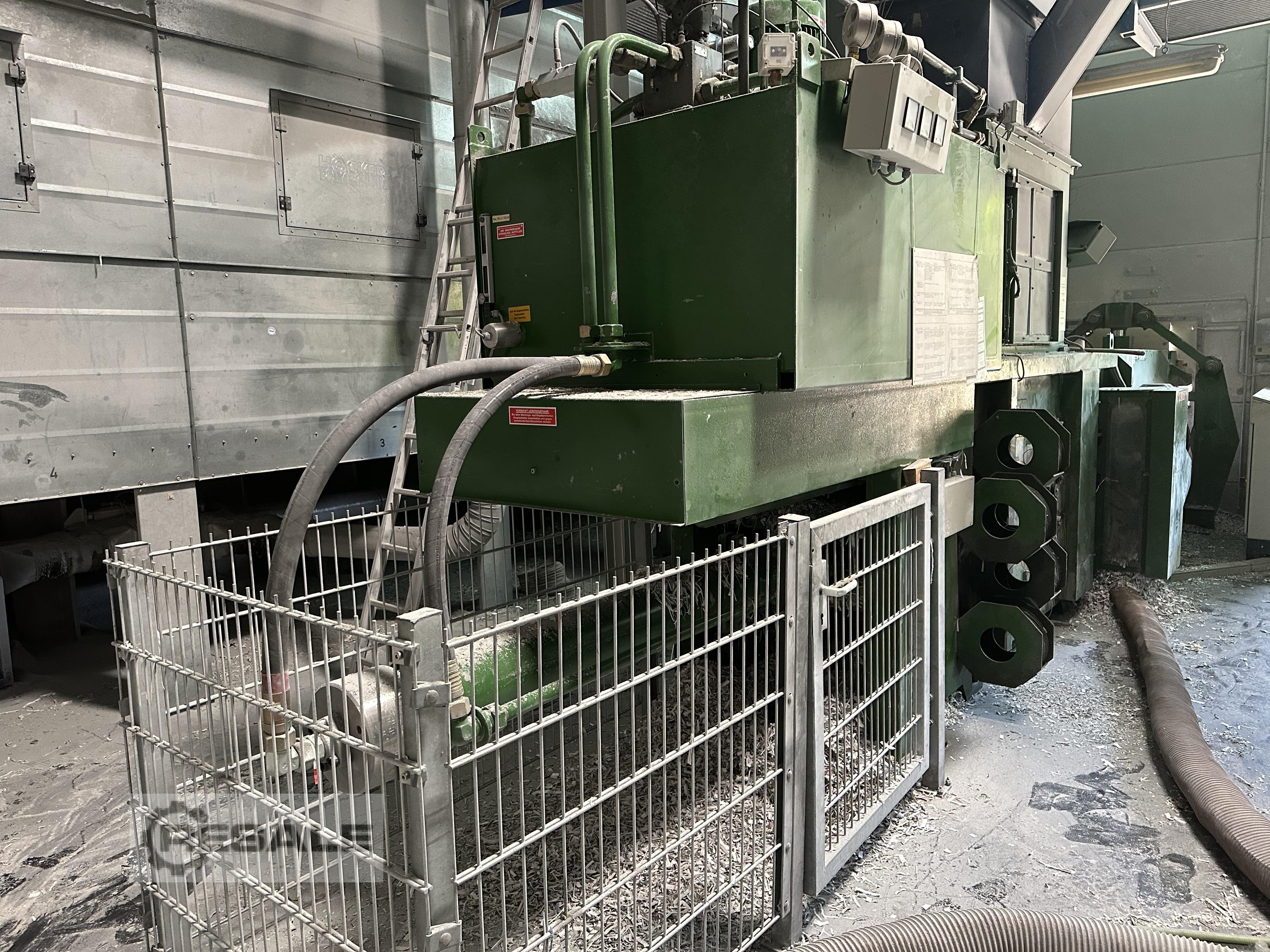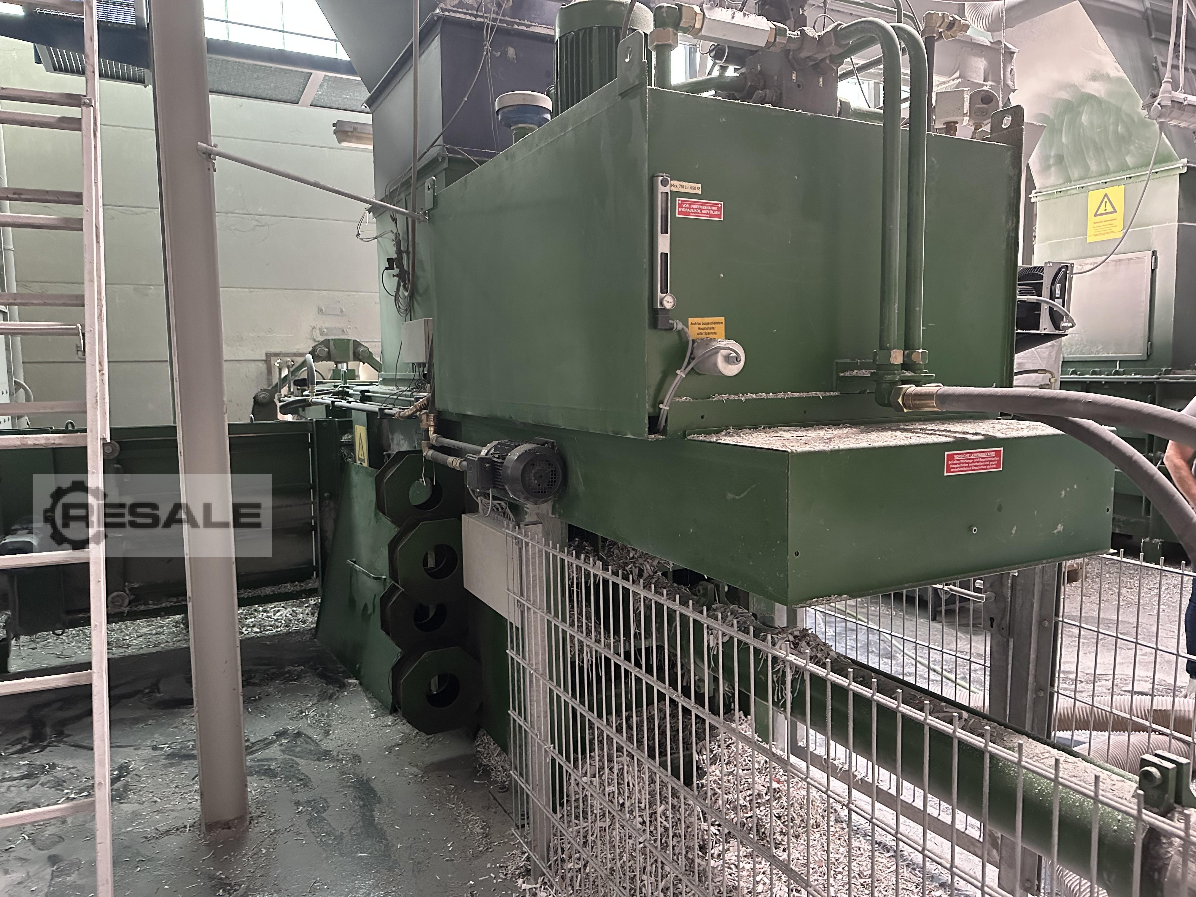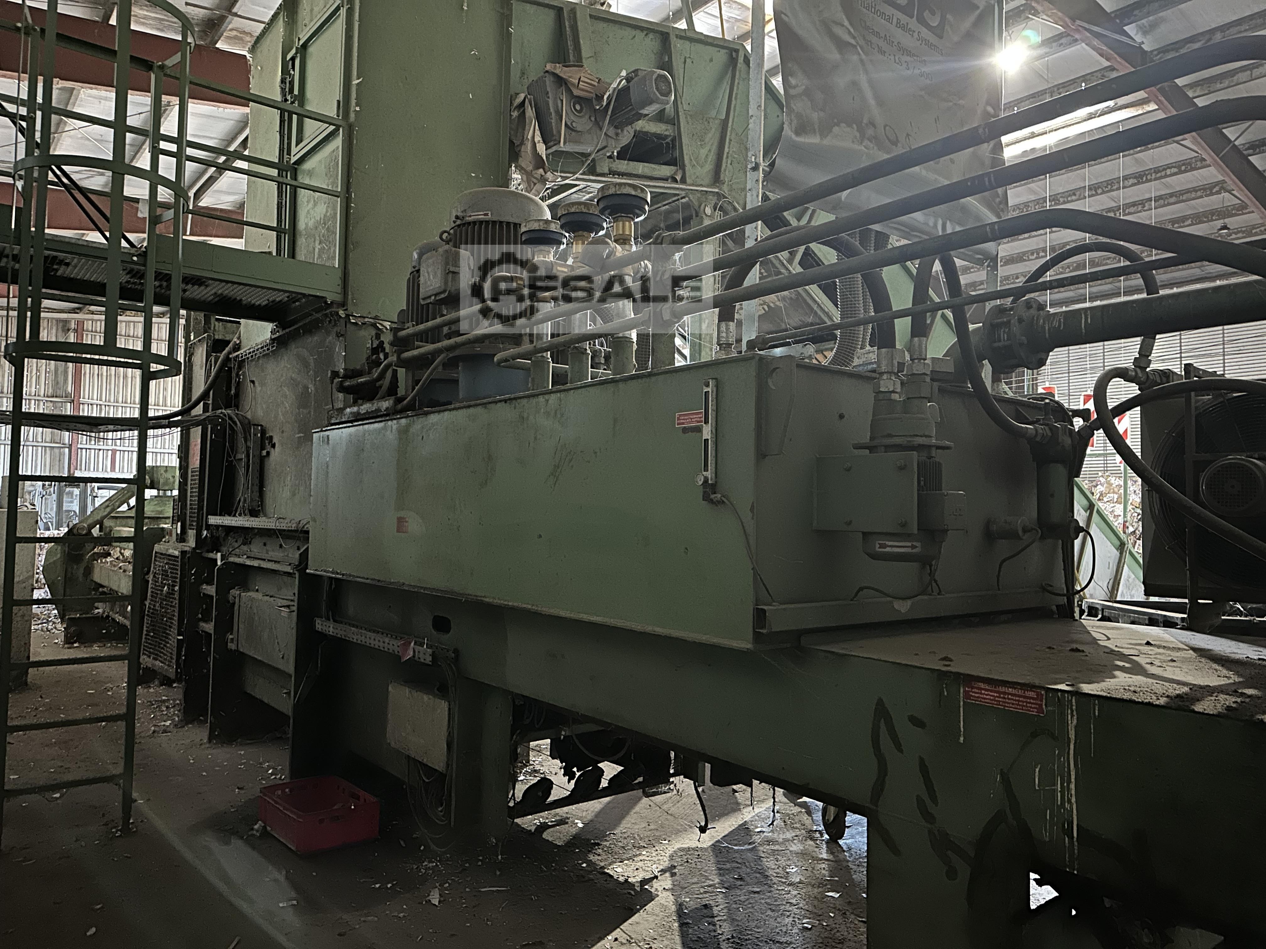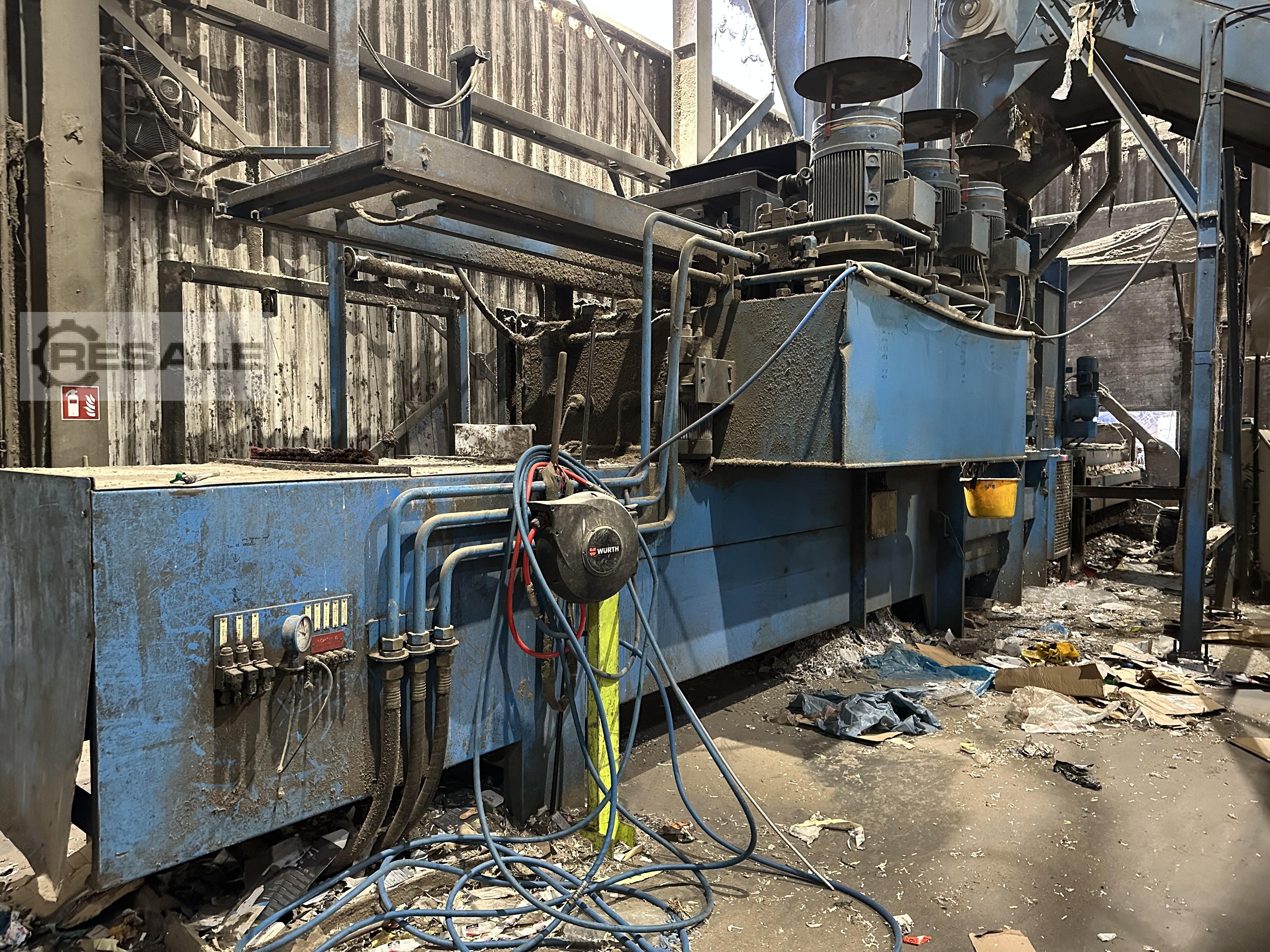 Gebrauchte PAAL KONTI 200 C. automatische Ballenpresse Hersteller: PAAL Typ: KONTI 200 C Baujahr: 1993 technische Daten: Presskraft: 50 t Kanalformat: 750 x 1.100 mm spezifische Presskraft: 6,06 kg/cm² Ballengewicht: 425 - 550 kg, je nach Material und Ballenlänge Einfuellöffnung: 1.400 x 1.020 mm Antriebsleistung: 45 kW Durchsatzleistung: 200 m³/h Pressleistung: - ca. 7,35 t/h bei Kaufhaus geschichtet (35 kg/m³ Schüttgewicht) - ca. 12,0 t/h bei Mischpapier (60 kg/m³ Schüttgewicht) - ca. 20,0 t/h bei Sammelware (100 kg/m³ Schüttgewicht) Abbindung: 4-fach vertikal Maschinengewicht: ca. 17 t