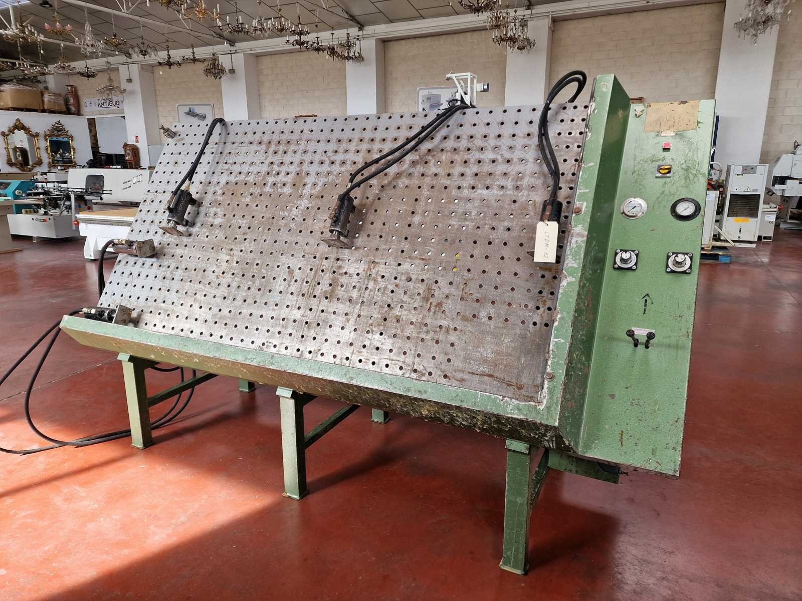 - Abmessungen des Arbeitstisches: ca. 2200 x 1200 mm. - Maximale Werkstücksmaße ca. 1950 x 1000 mm. - Perforationen im Tisch alle 60 mm in den beiden Richtungen. - 5 verstellbare hydraulische Klemmzylinder. - 1,50 kW 1400 U/min Hydraulikpumpe. - Betriebsbedingungen dieser Maschine: unkontrolliert. - Dieser Gegenstand wird per LKW geliefert. Die Kosten für Demontage und Beladen sind diejenigen, die als zusätzliche Kosten angegeben sind. Auktions-ID: A7-44536-11