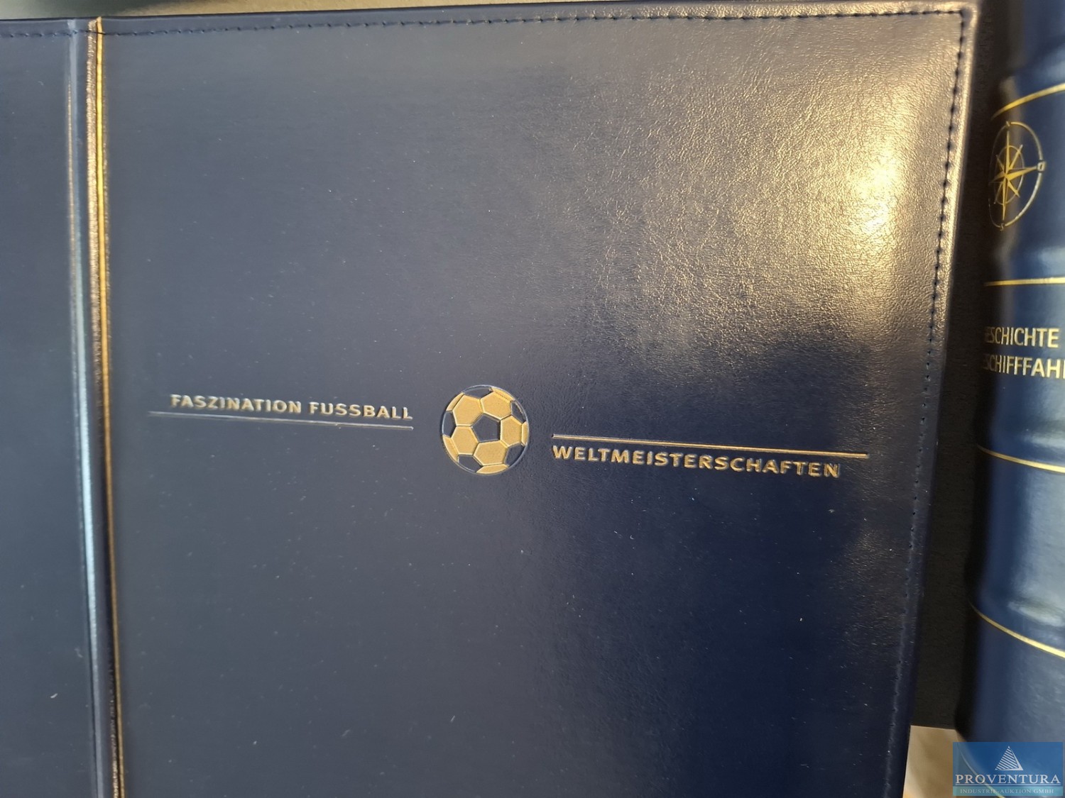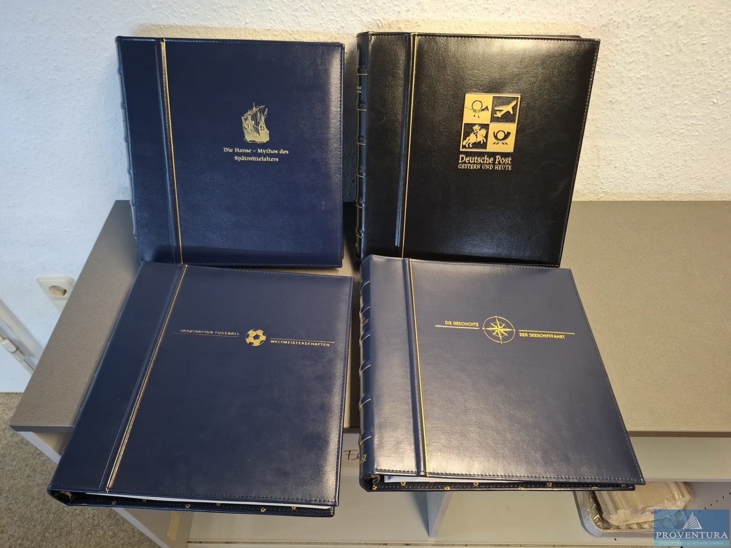 Themenalben Hanse - Deutsche Post - Fussball-WM - Seeschiffahrt 4 Alben, mit Briefmarken dekoriert, teils OriginalBeleg, teils Faksimiles, 1 Karton