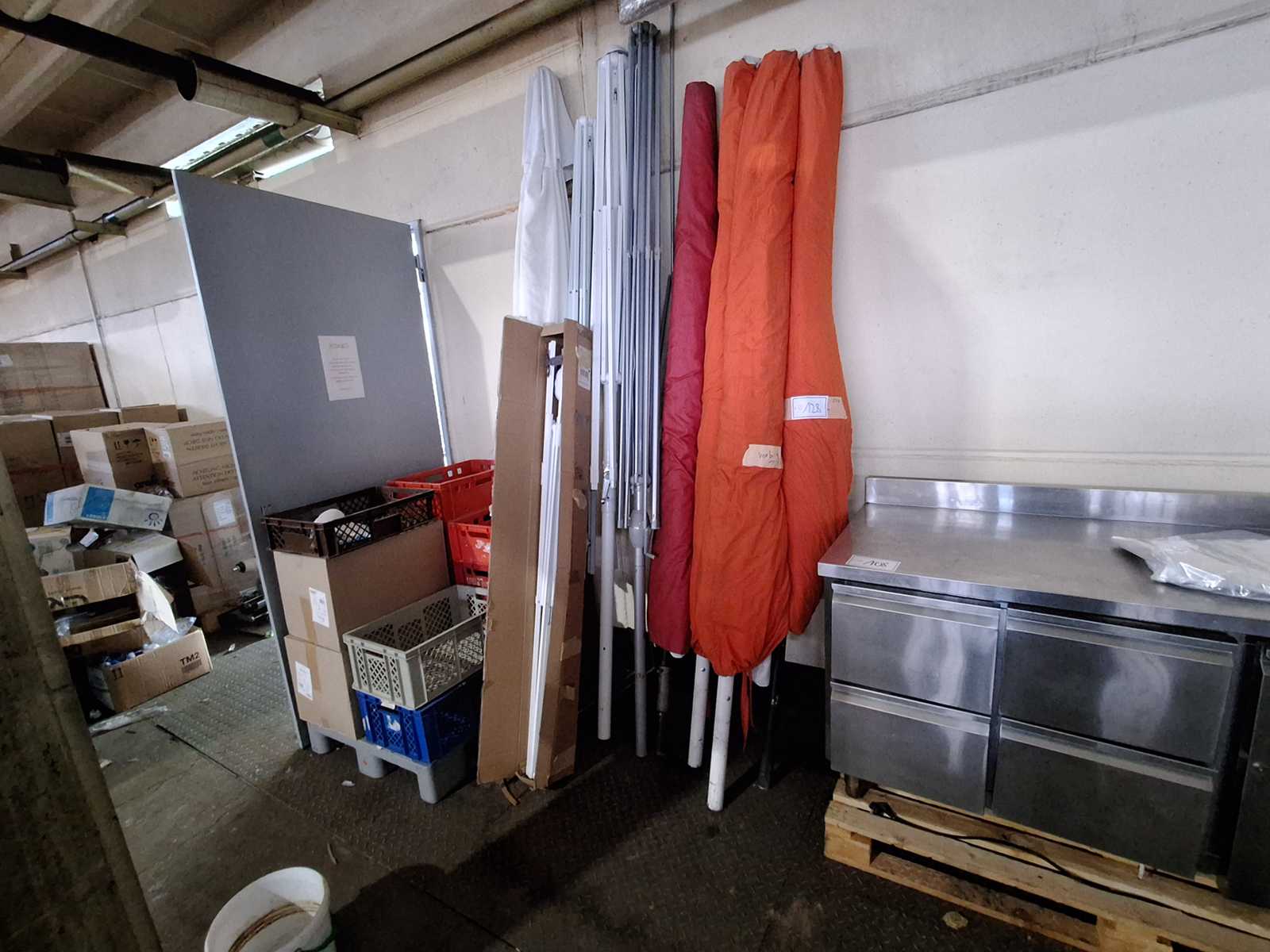 Posten Terassen - Sonnenschirme, 5 Sonnenschirme für Gastronomie / teilweise mit Überzugschutz, Farbe Hell dazu 4 weitere Gestelle ohne Stoff, Höhe 2700 mm / Ø ca. 4000 mm Auktions-ID: A7-45677-128