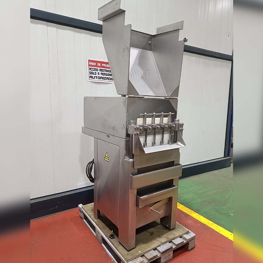 Es handelt sich um eine halbautomatische Hochleistungsmaschine, die bis zu 320 Scheiben pro Minute produzieren und bis zu 3.000 kg Fleisch oder Speck pro Stunde würfeln kann, mit einem Temperaturbereich von minus 5 °C bis + 80 °C. Es kann für eine Vielzahl von Anwendungen eingesetzt werden, vom Schneiden von Fleisch mit Knochen mit einem speziellen Messer bis hin zum Würfeln einer Vielzahl von knochenlosen Materialien. Die Schnittqualität ist ausgezeichnet, ohne Splitter. Multiplex-Systemgitterdesign, leicht zu reinigen und auszutauschen. Die Dicke der Schneidefunktion ist von 0,5 bis 32 mm einstellbar. Das Gerät sorgt für eine optimale Schneidklinge. Der Arbeitsbereich des Gerätes ermöglicht die Vorbereitung von 3 Kunststoffkisten mit Rohmaterial (ca. 150 kg). Dieser Arbeitstisch sorgt für komfortable Arbeitsbedingungen. Die Maschine ist mit einer halbautomatis ...