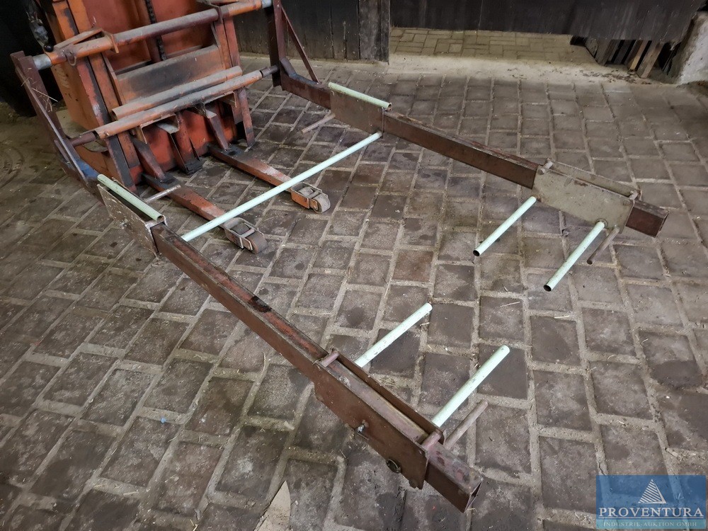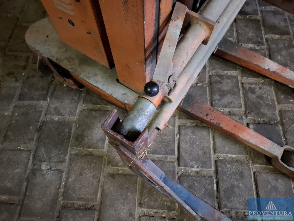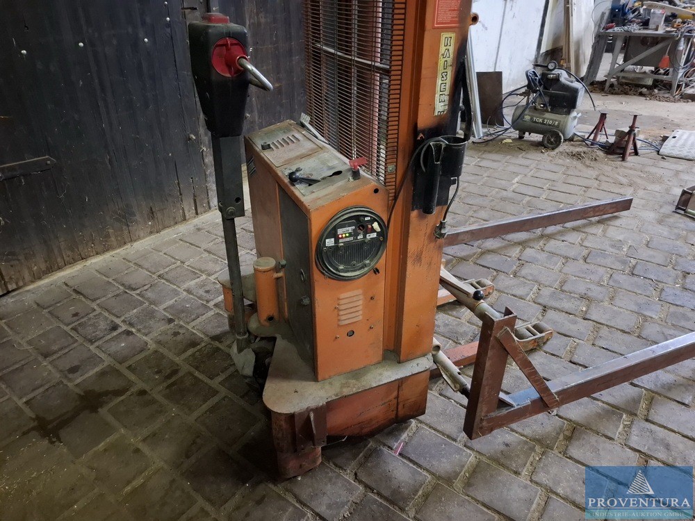 Rasenmäher Hebebühne Eigenbau aus Kaiser&Kraft Hochhubwagen Bj.1989, Eigengewicht ca. 600kg, Gesamthöhe ausgefahren ca. 3.200 mm, Hubhöhe unterm Radgreifer ca. 2.750 mm, Aufnahme verstellbar für verschiedene Aufsitzmäher größen, Traglast ca. 1.000kg je nach Hubhöhe und Ausladung, Fahrantrieb funktioniert ist aber schwach, mit Wandbefestigung für sichereren Stand, Arretierung/Sicherung gegen Absenken.