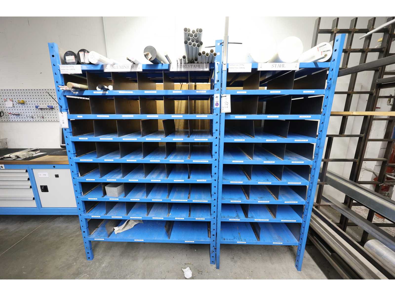 Bestehend aus 6 Aufrechten zu je 300x80 cm und 52 Regalen mit 26 Regalen zu je 180 cm. Abholen am Ende des Inkassotages ohne Inhalt Auktions-ID: A1-45411-247