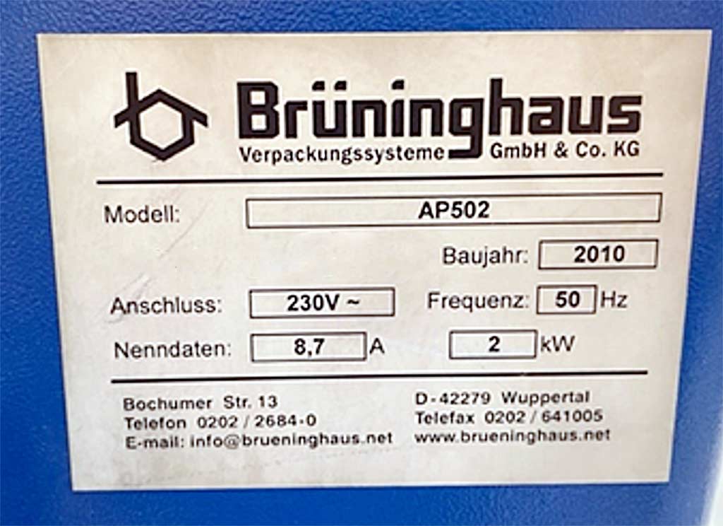 Eine Luftpolstermaschine Brüninghaus (Fromm) steht zur Verfügung. Folienbreite: 420mm, max. Folienrollendurchmesser: 280mm, Folienlängenbereich: 500mm-1000mm, Folienkerndurchmesser: 76mm, Folienart: AIRPAD, Folienstärkenbereich: 0,042mm-0,08mm, Leistung: 25-49Zyklen/min. Maschinendimensionen X/Y/Z: ca. 2100mm/800mm/1300mm, Gewicht: ca. 270kg. Dokumentation vorhanden. Eine Besichtigung vor Ort ist möglich.