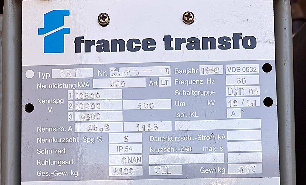 Ein Mittel- auf Niederspannungs-Verteilungstransformator France Transfo steht zur Verfügung. Leistung: 800kVA, Oberspannung: 10000V, Überspannung: 12kV, Stoßspannung: 75kV, Wicklungsprüfung: 28kV, Schaltung: D YN05, Isolationsklasse: A, Nennstrom: 46,2A/1155A, Kurzschlussspannung: 6%, Kühlart: ONAN, Ölgewicht: 450kg, Gewicht: 2100kg. Dokumentation vorhanden. Eine Besichtigung vor Ort ist möglich.