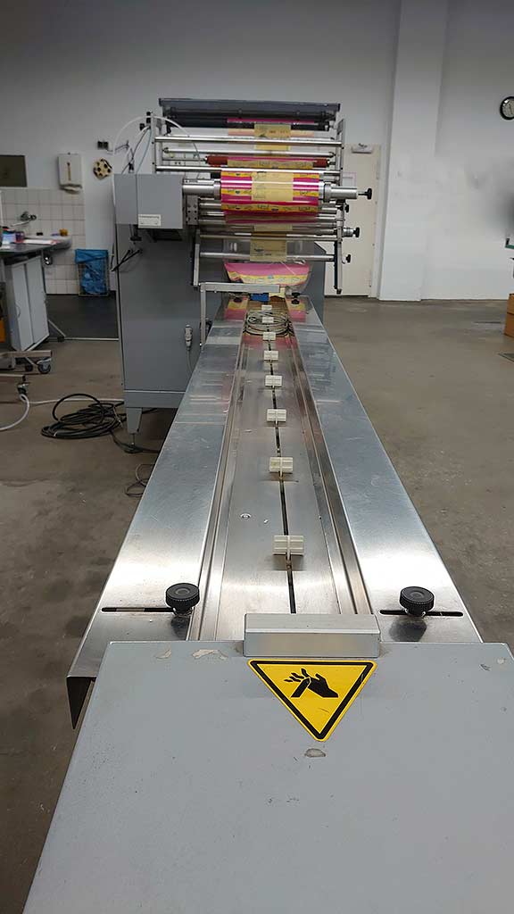 Verpackungsleistung Einfachbacke/Doppelbacke: 100/200/h, Siegelbackenabstand: 150mm, Siegelbackenbreite: 250mm, Produktlängenbereich: 50mm-500mm, Produktbreitenbereich: 20mm-230mm, max. Produkthöhe: 120mm, max. Cut-Off: 650mm, max. Folienbreite: 650mm, max. Rollendurchmesser: 350mm, Rollenkerndurchmesser: 76mm, max. Rollengewicht: 40kg, Maschinengewicht: ca. 850kg. Dokumentation vorhanden. Eine Besichtigung vor Ort ist möglich.