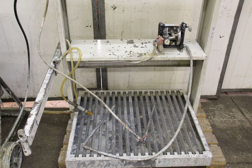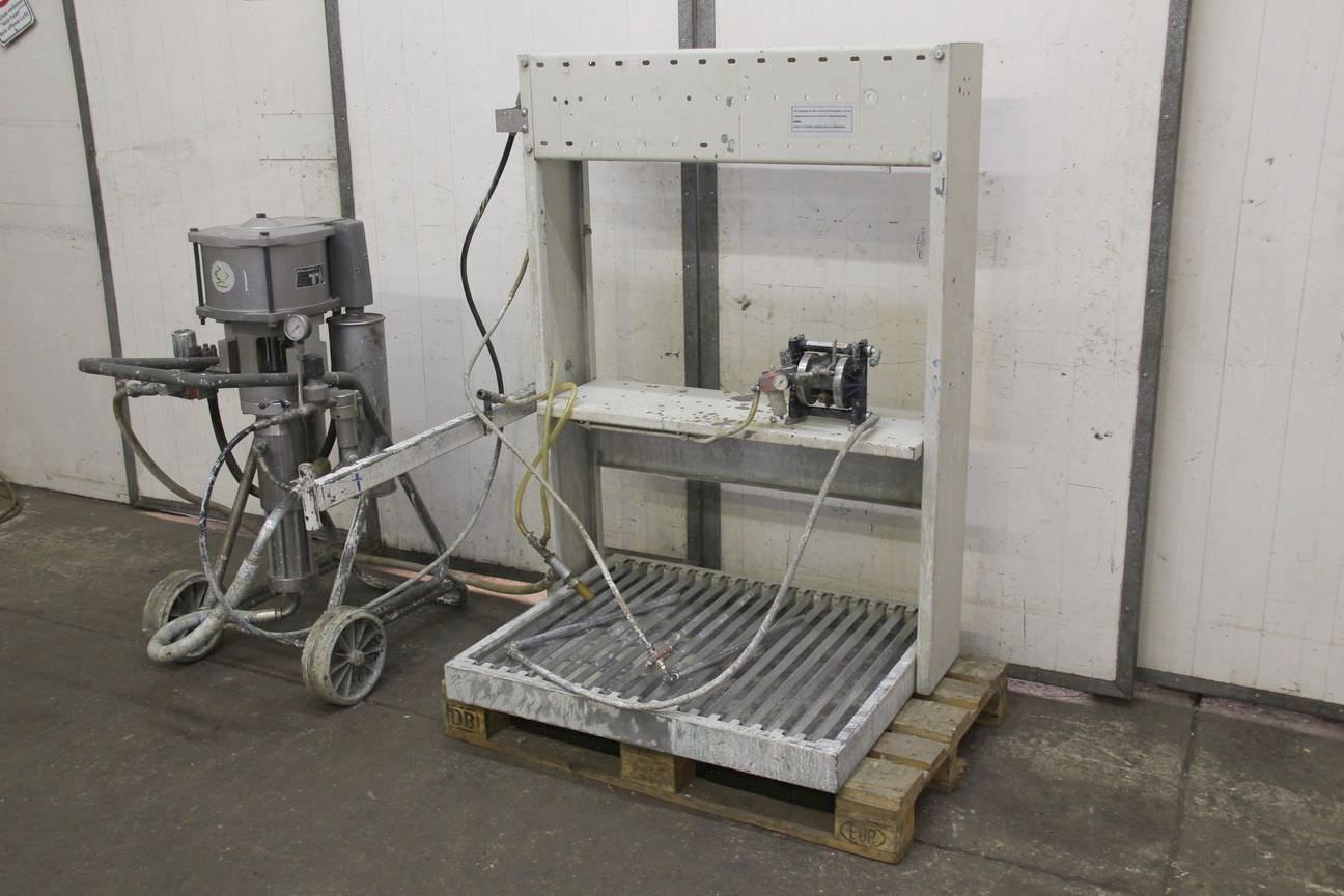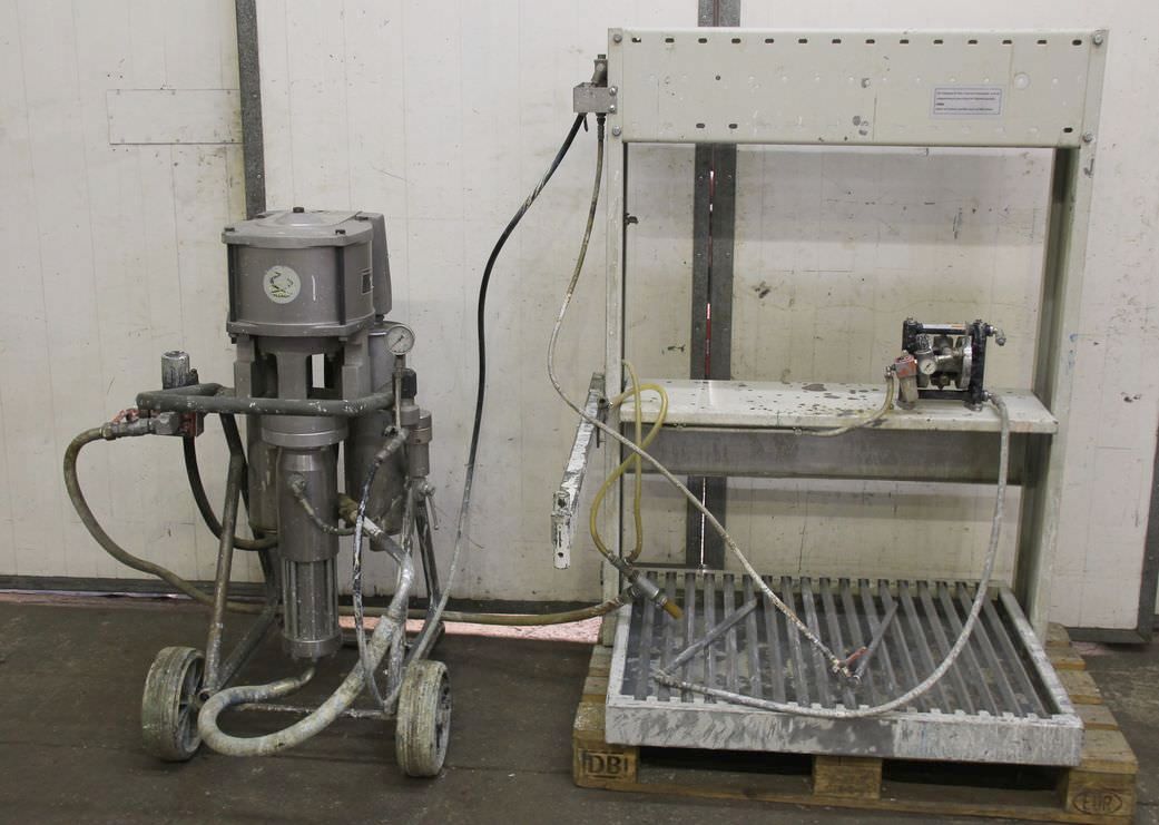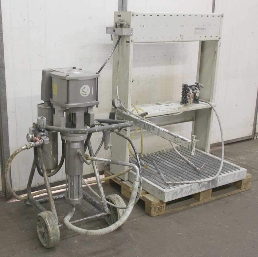 pneumatische Kolbenpumpen, Airless Hochdruckpumpe, Luftmotor, AIR MOTOR-pneumatische Kolbenpumpe Hersteller Böllhoff-Typ: DB-55.150-Materialvolumen: max. 7,5 l/min-max. Druck: 330 bar-Materialtemperatur: max. 90 °C-Abmessungen Pumpe: 1100/900/H1250 mm-Gewicht: 132 kg-mit: Abtropfwanne und Membranpumpe-Hersteller Graco Typ: Husky 307-Abmessungen: 1140/1300/H1500 mm-Gewicht: 146 kg