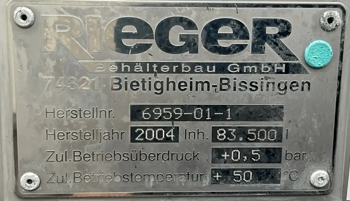 Ausstattung: Überdruck,Hersteller: RIEGER Behälterbau GmbH,Zustand: gebraucht,Volumen: 83.500,Max. Überdruck: 0.5,Max. zul. Betriebstemperatur : 50,Spezifisches Gewicht des Mediums: 1,35,Bauform: stehend,Standform: Füße höhenverstellbar,Anzahl Füße: 8,Durchmesser innen: 3.850,Zylindrische Höhe: 600,Gesamthöhe: 8.690,Wandstärke Unterboden: 5.4,Wandstärke Oberboden: 3.0,Baujahr: 2004,Technische Unterlagen: Zeichnung,Mannloch / Dom: im Zylinder (ca. 350 x 450 mm),Typenschild: Ja,Ausstattung: Be-/Entlüftung, Sprühkopf, Kranösen,Auslauf: DN100 DIN 11851 ,Bemerkungen: Angegebene Gesamthöhe entspricht der Fertigungszeichnung und kann ggf. leicht abweichen,letzter Verwendungszweck: Fruchtsaft,Werkstoff Produktberührend: V2A 1.4301 (AISI304),Material Füße: Edelstahl,Bodenlager: Nein,Stromstörer: Nein,Bodenlager: Nein,Stromstörer: Nein