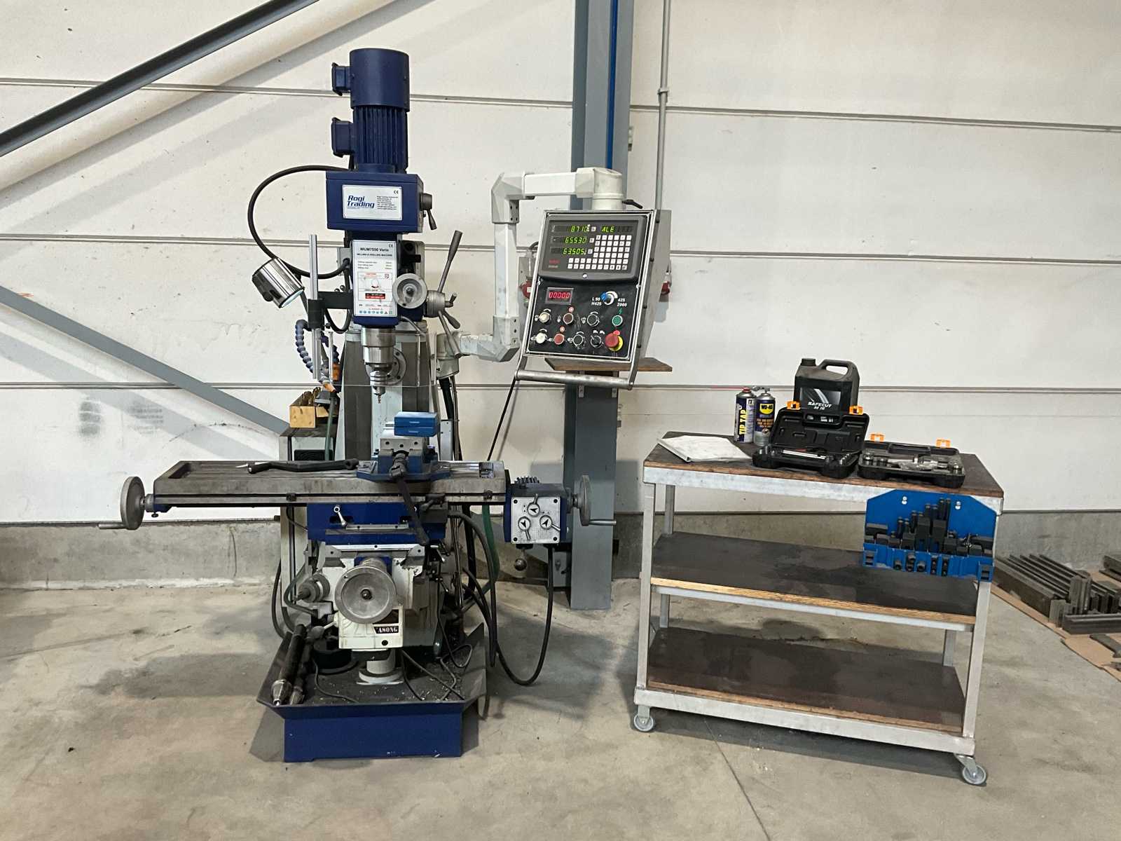 Vollständig funktionierende Fräs-/Bohrmaschine mit digitaler Auslesung und variabler Geschwindigkeit. Ausgestattet mit Kühlanlage, Maschinenklemme und Werkzeugen. Die Maschine ist funktionsfähig und sehr wenig genutzt, im März 2022 gekauft (Rechnung verfügbar) – inklusive Walzarbeitstisch mit Material auf dem Foto – Bohrkapazität Stahl 50 mm, Fräsfassungsstahl 25 mm, Mantelfräskapazität 100 mm, Horizontalmotor 1,5 kW, Vertikalmotor 2,2 KW, Drehzahlbereich horizontale Frässpindel 60 ~ 1350 U/min, Drehzahlbereich vertikale Frässpindel: variable 100 ~ 2000 U/min, Spindelhalter ISO 40, Tabelle 1000 x 240 mm – EINSCHLIESSLICH: 3-Achsen-Digitalanzeige SINO Automatischer Längs- und Querzuführtisch LED-Beleuchtung Kühlsystem Deluxe-Steuerbox Neigung des Fräskopfes nach links/rechts 0 - 45 Grad Schwenkbare Arbeitstisch DELTA-Frequenzschalter – sofort einsetzbar! Au ...